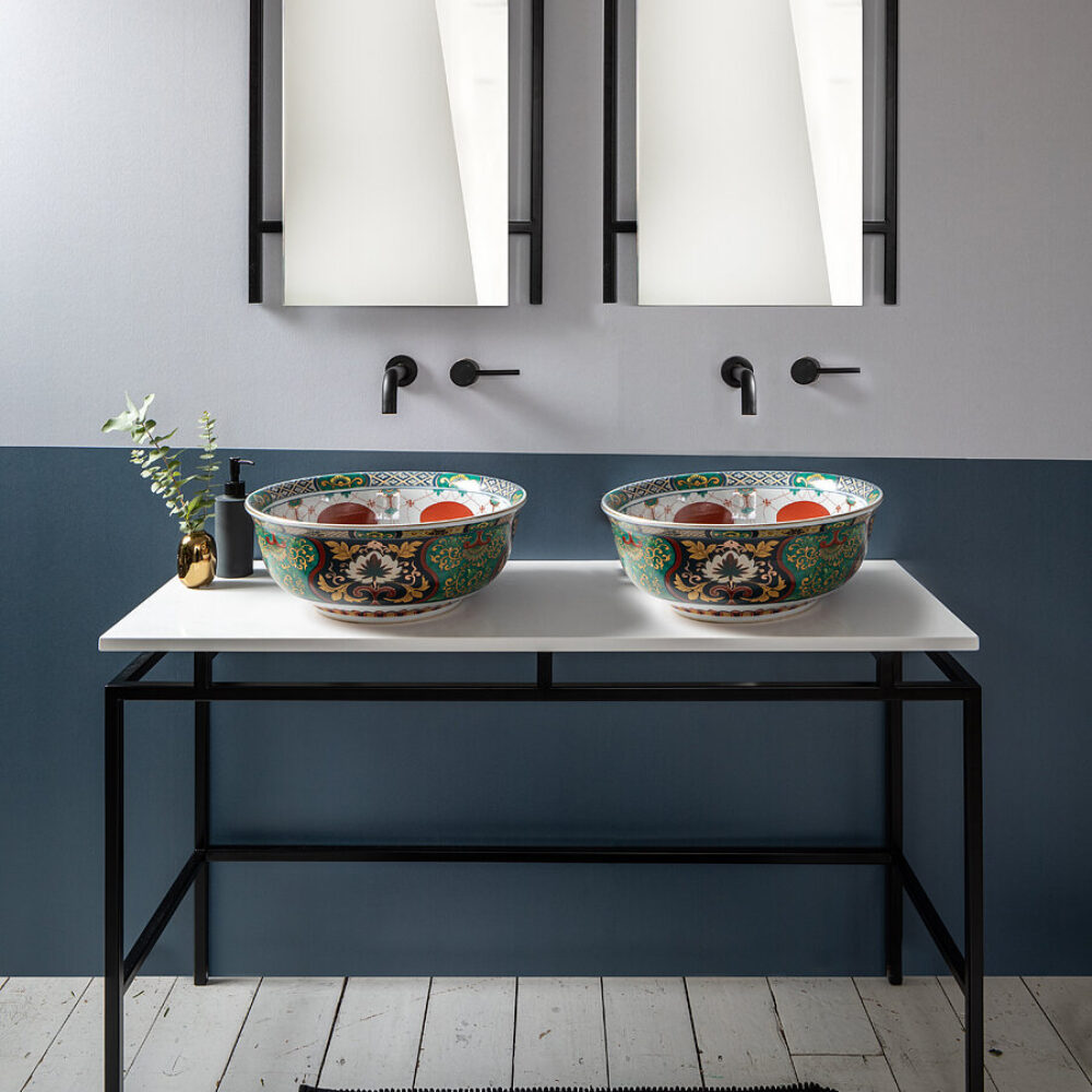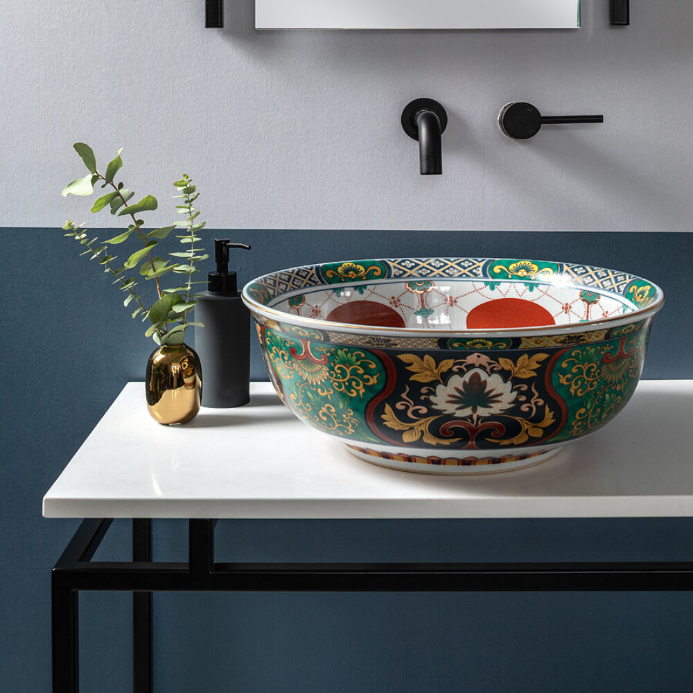 Rich emerald green plays off regal blue through an intricate pattern inspired by traditional Oriental design. Inside the Adriana countertop basin, cool white comes flecked with gold and accented by red spheres to make for a distinctive, hand-crafted basin that can be paired with either modern or traditional taps, mirrors and vanity units.