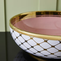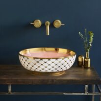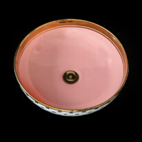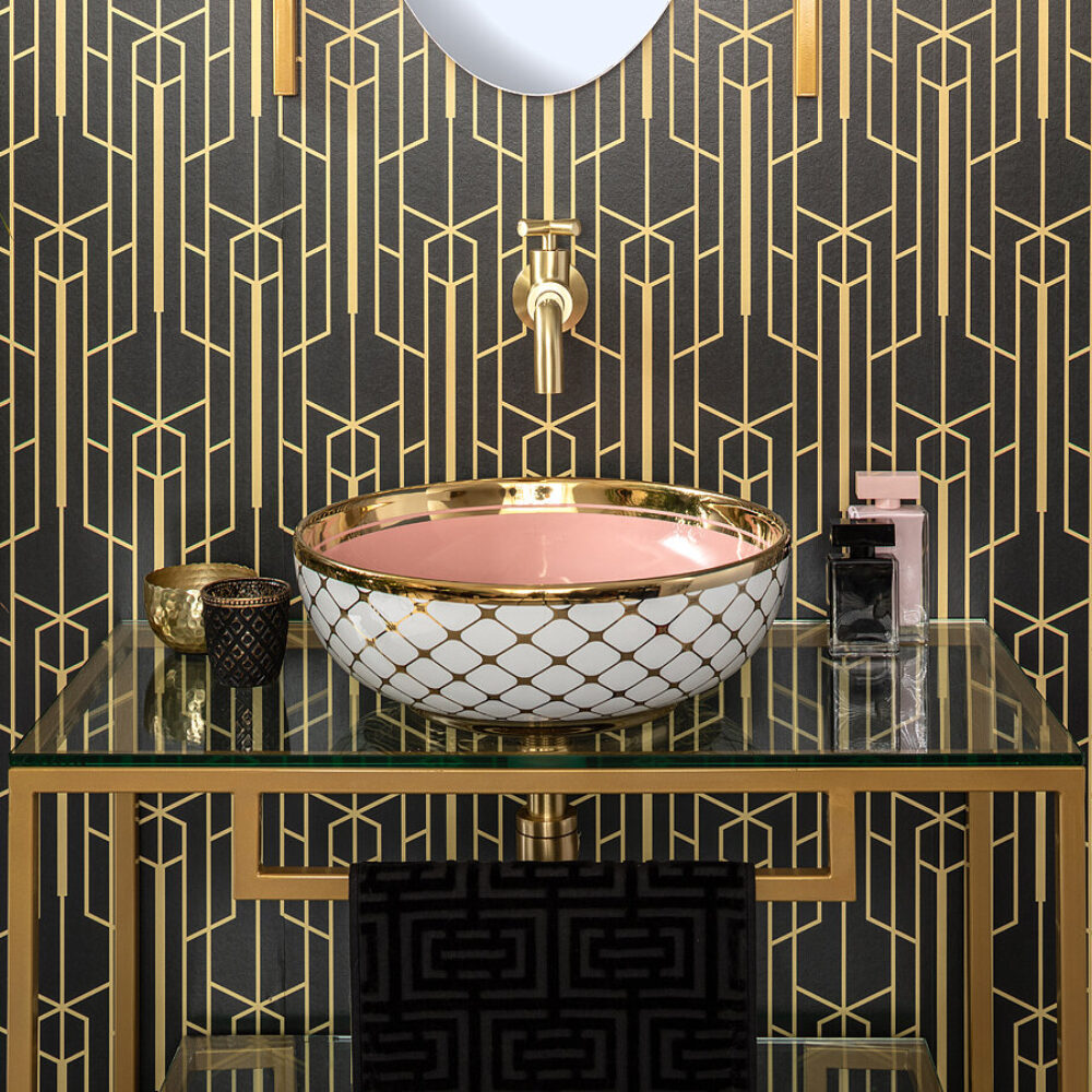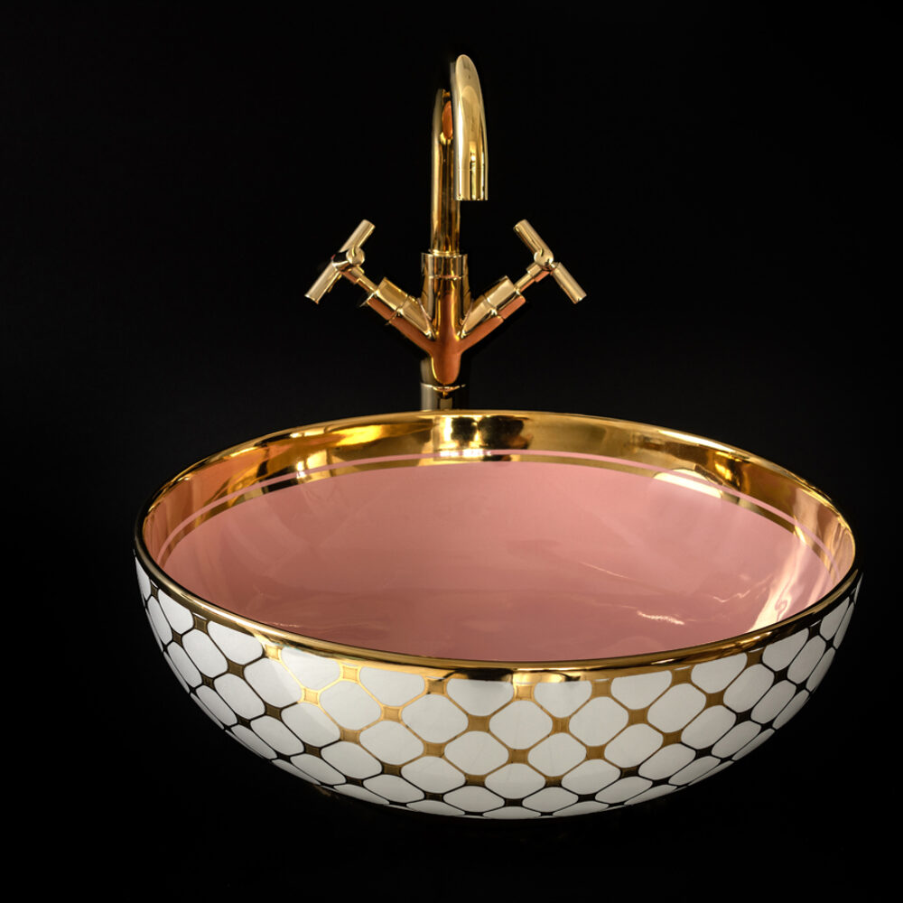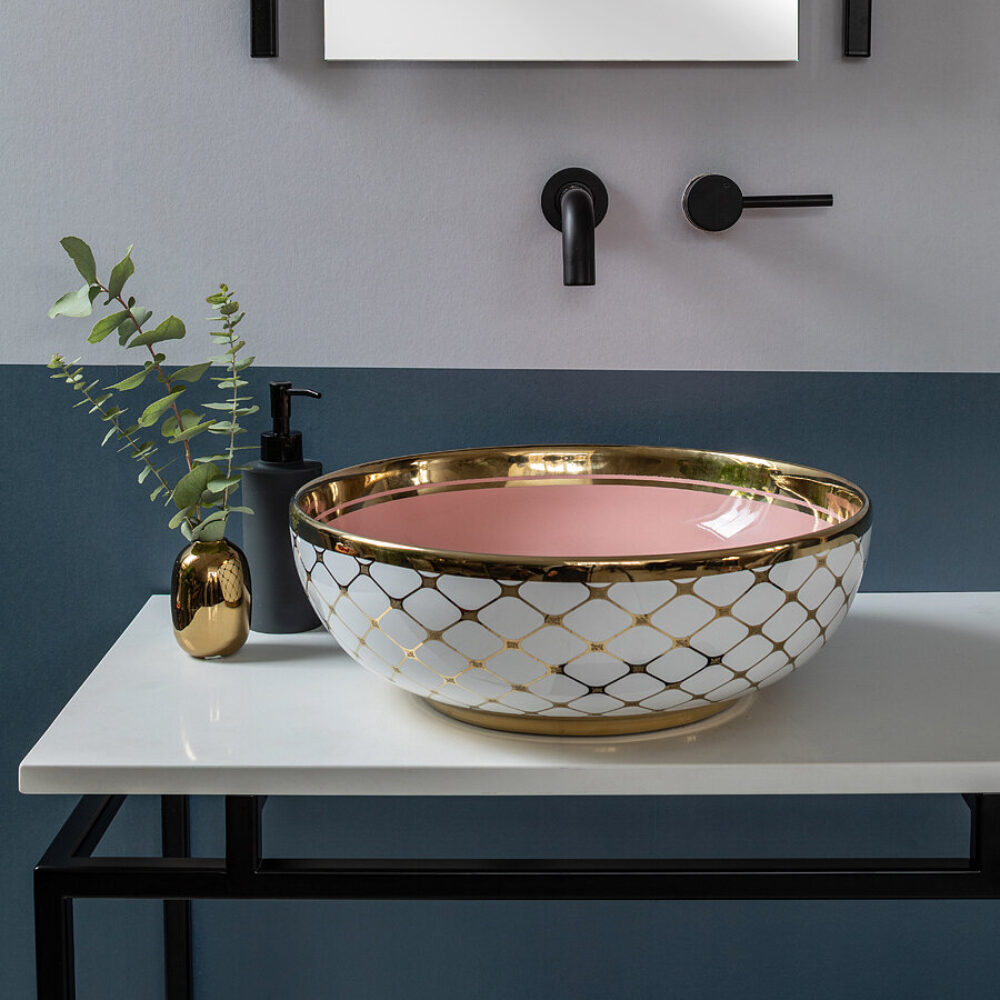 Step into the sun-bleached warmth of Miami. The Agnes countertop basin pairs a playful pink lemonade colour with a golden tile pattern and striking bold rim that hints at the decadence of the Art Deco period. The finest porcelain comes with a high gloss finish and can be paired with various different faucets and vanity units.