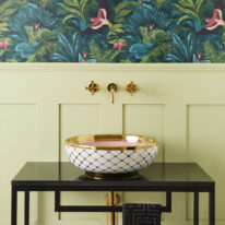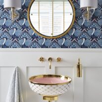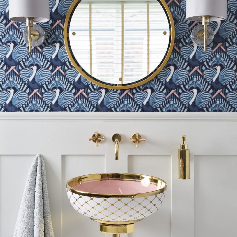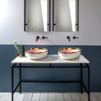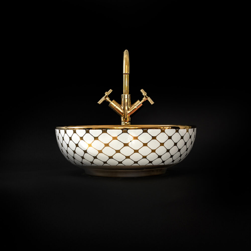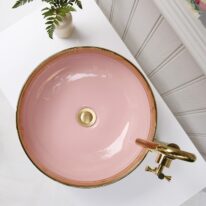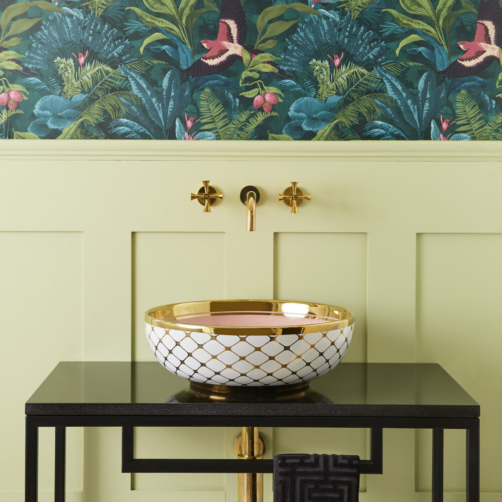 Step into the sun-bleached warmth of Miami. The Agnes countertop basin pairs a playful pink lemonade colour with a golden tile pattern and striking bold rim that hints at the decadence of the Art Deco period. The finest porcelain comes with a high gloss finish and can be paired with various different faucets and vanity units.