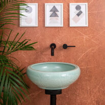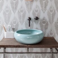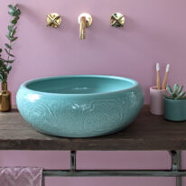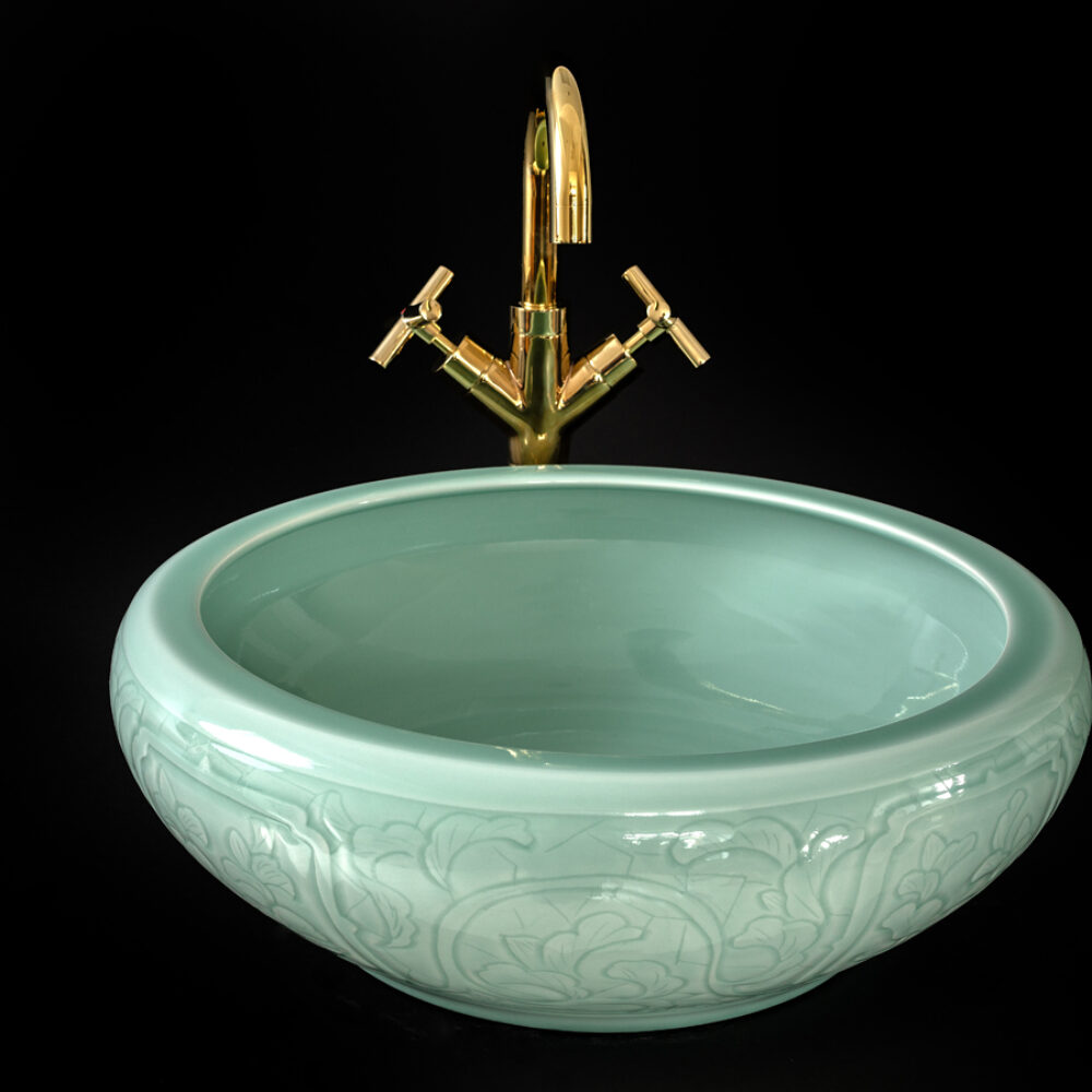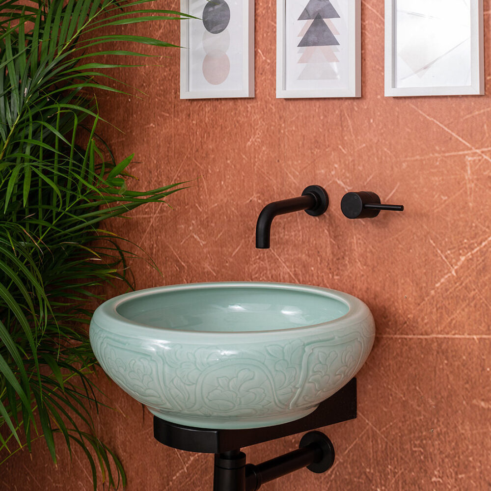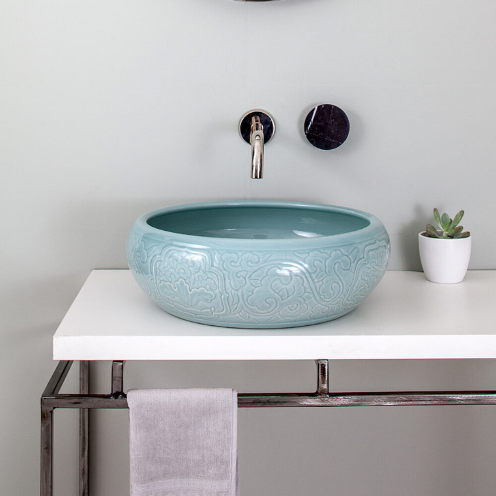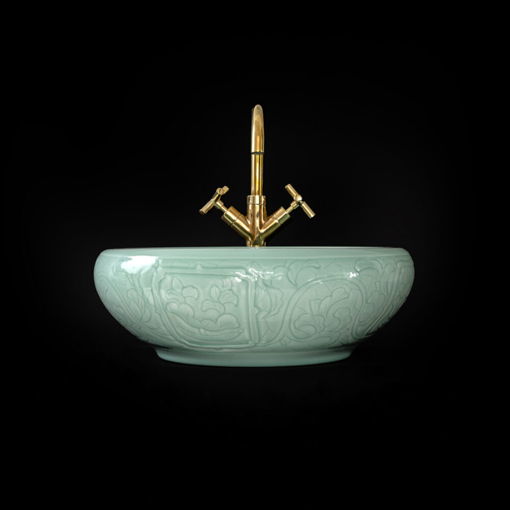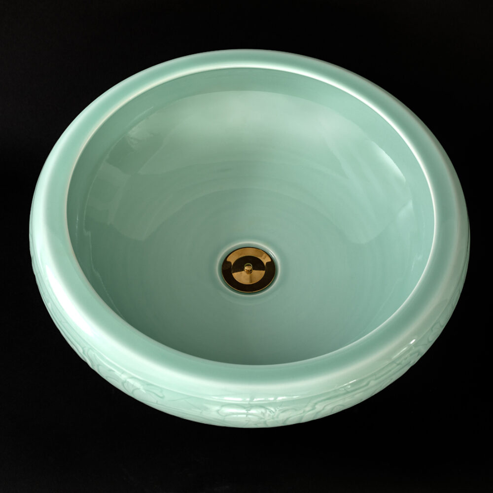 A simple but stand-out piece, the Blossom countertop basin brings a timeless Oriental touch to your bathroom. Hand-crafted blue celadon porcelain comes embossed with a delicate lotus pattern and an all-over high gloss finish. Charming with classic brass faucets or something more contemporary.