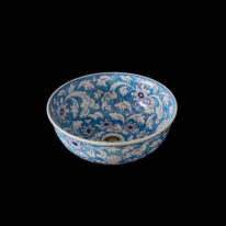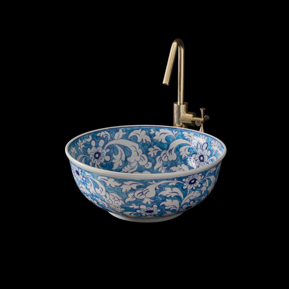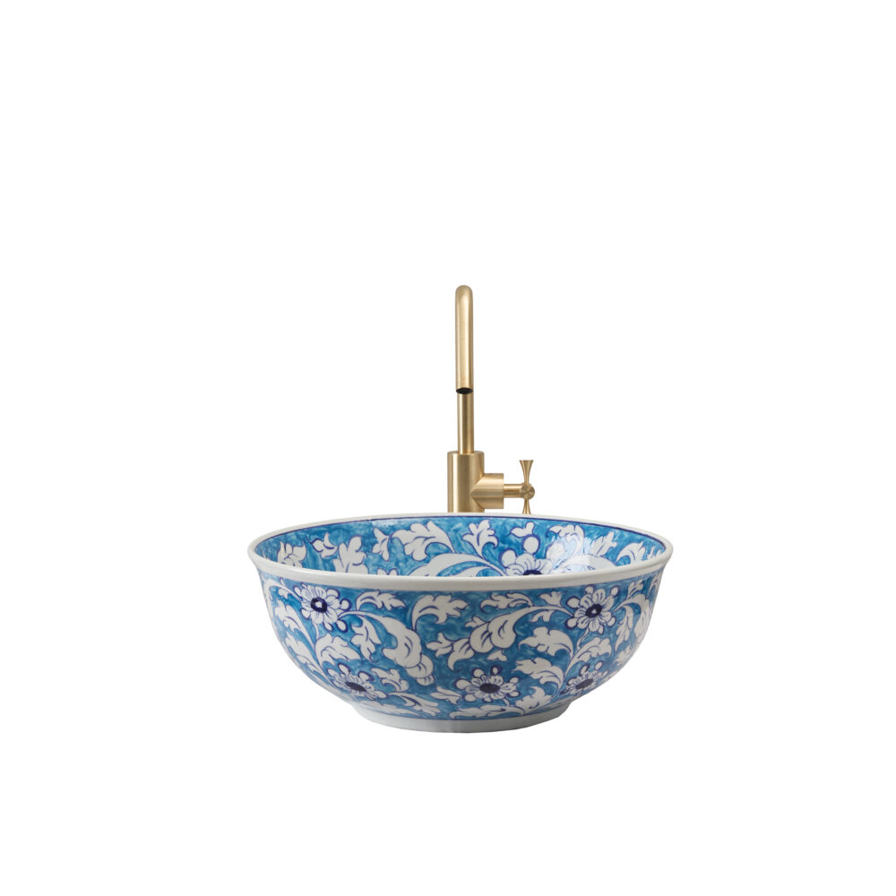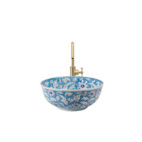An ode to the floral patterns of the old-world Mediterranean, the Cecelia basin conjures thoughts of traditional Italian porcelain with a distinctly rustic feel. This unique design features an intricate sprawl of white flowers and whimsical leaves dancing playfully against a vivid blue background, reminiscent of a clear blue sky. The Cecelia is crafted from the finest porcelain and expertly painted by hand so that every basin is unique, adding to its charming nature. Pair the Cecelia basin with any London Basin Company vanity unit for a striking combination that is sure to make a bold impact.