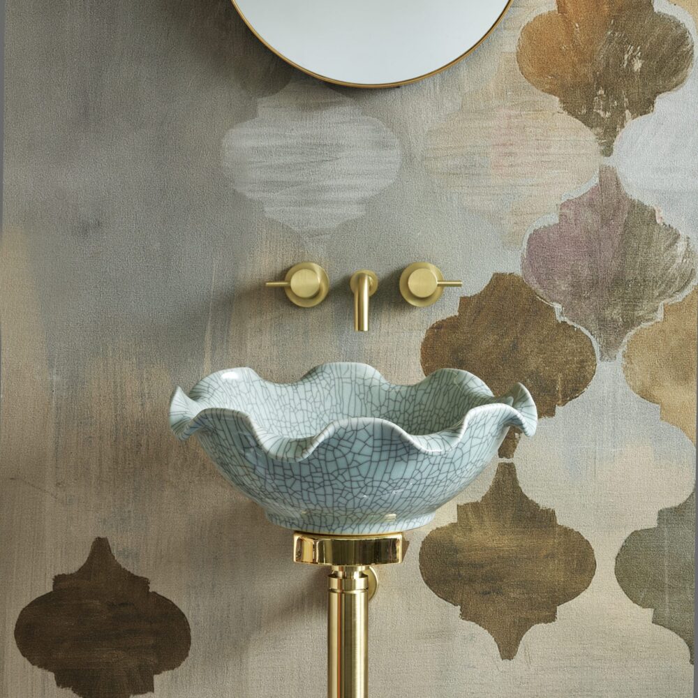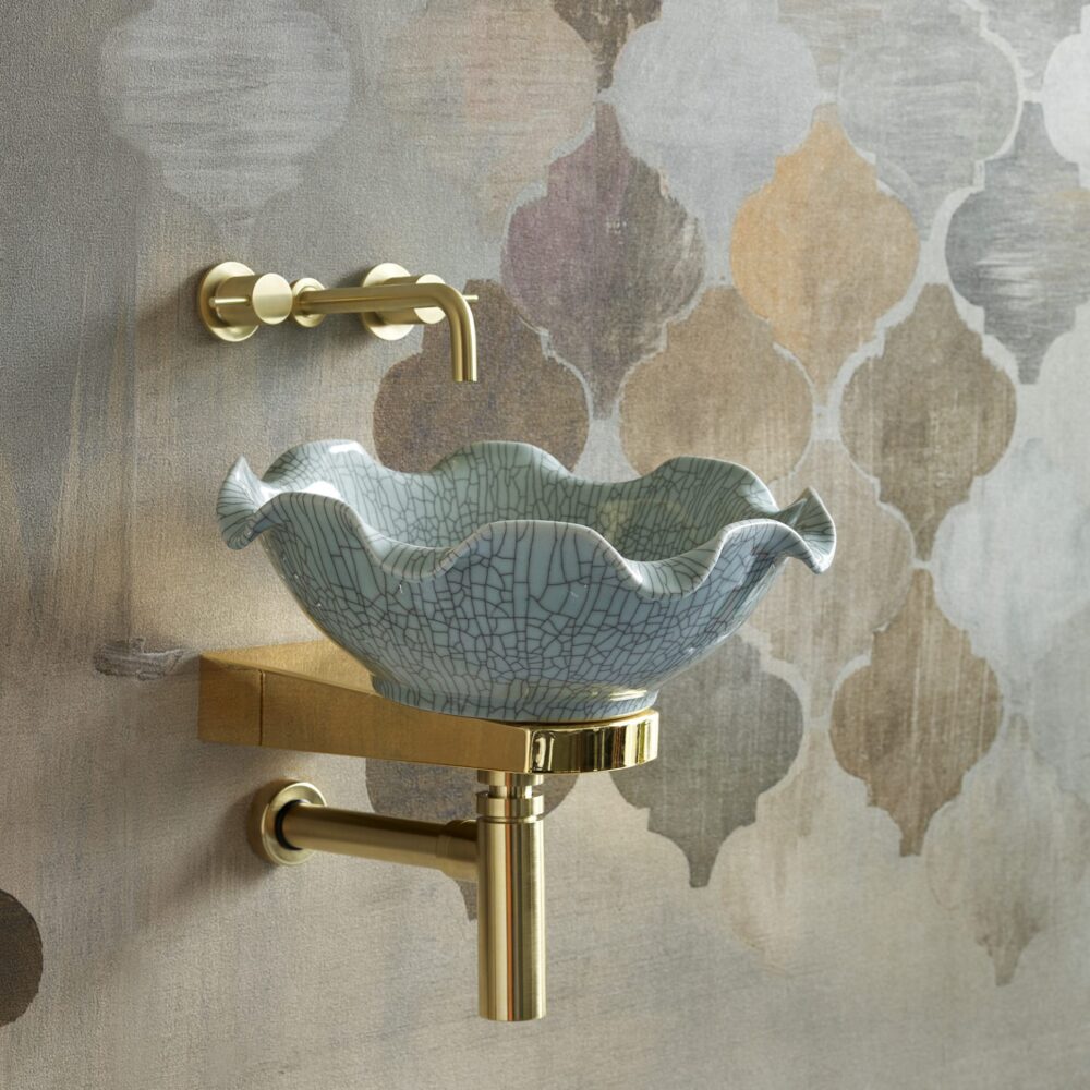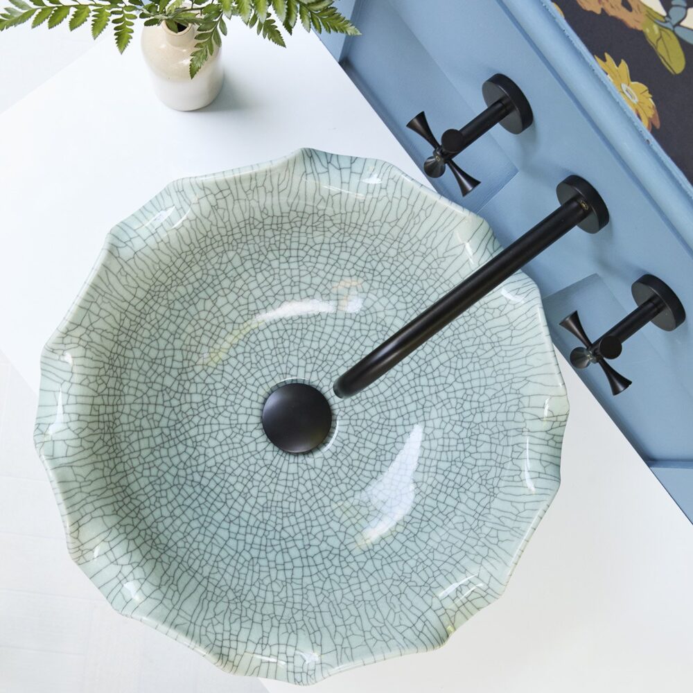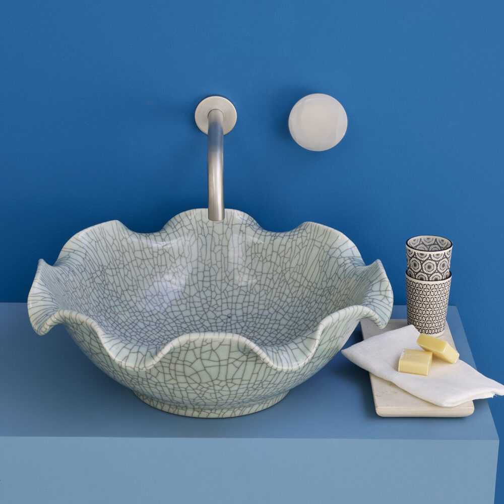 With its soft greeny-blue colour, hand finish, exquisite craftsmanship and nod to traditional Asian celadon ware, the Celestine unites a beautiful floral shape with a distinctive crackle glaze. Both elegant and versatile, it works just as well with modern accessories as it does with traditional brassware when completing the bathroom of your dreams.