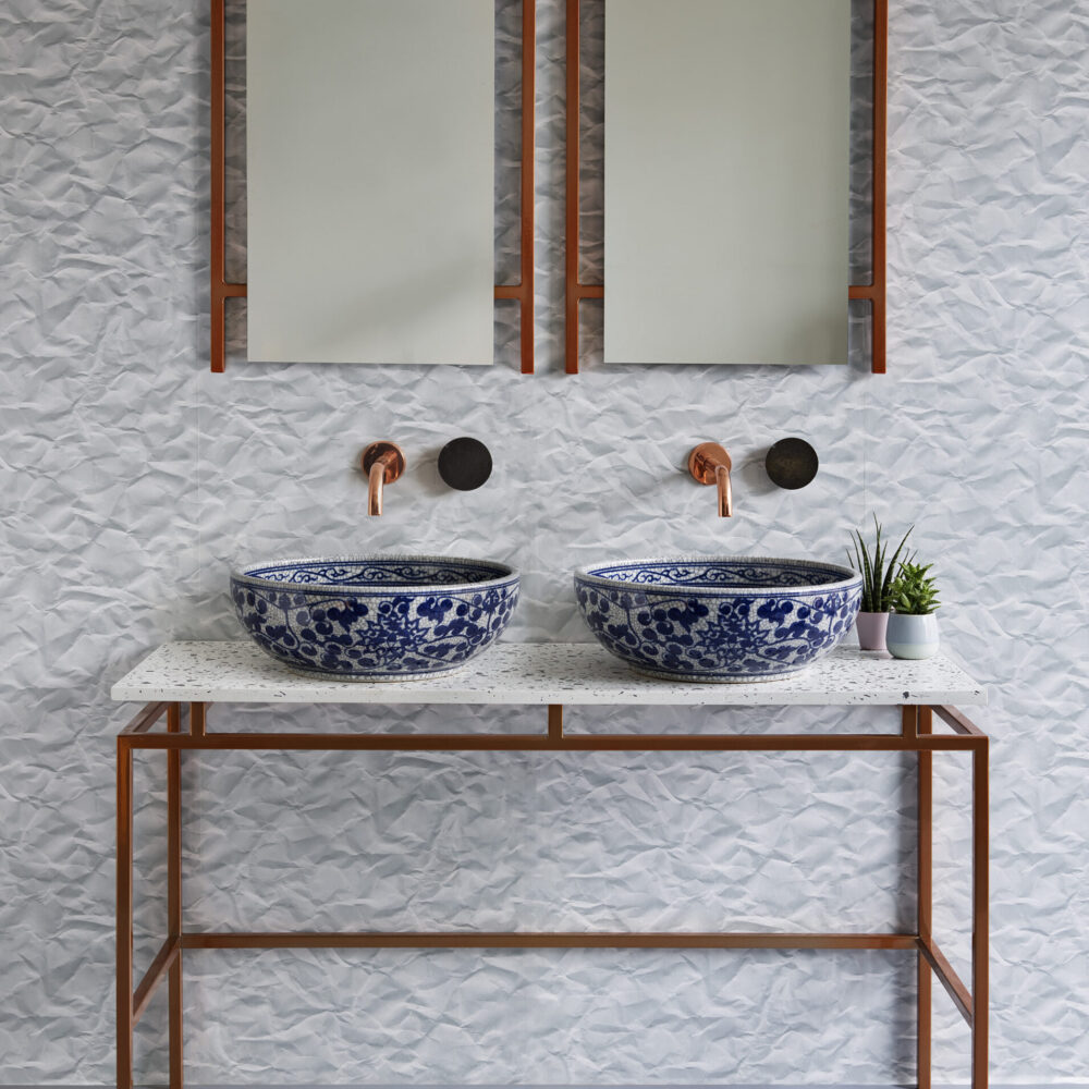 The timeless appeal of blue and white comes with a twist, thanks to the Coralie basin. Hand-crafted with a distinctive crackle glaze, the swirl of an Oriental pattern lends it a fresh yet classic quality that we find works as well against simple, minimalist backgrounds as it does amidst vibrant settings.