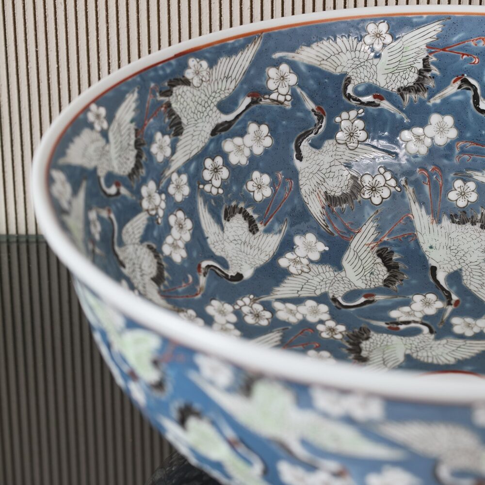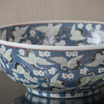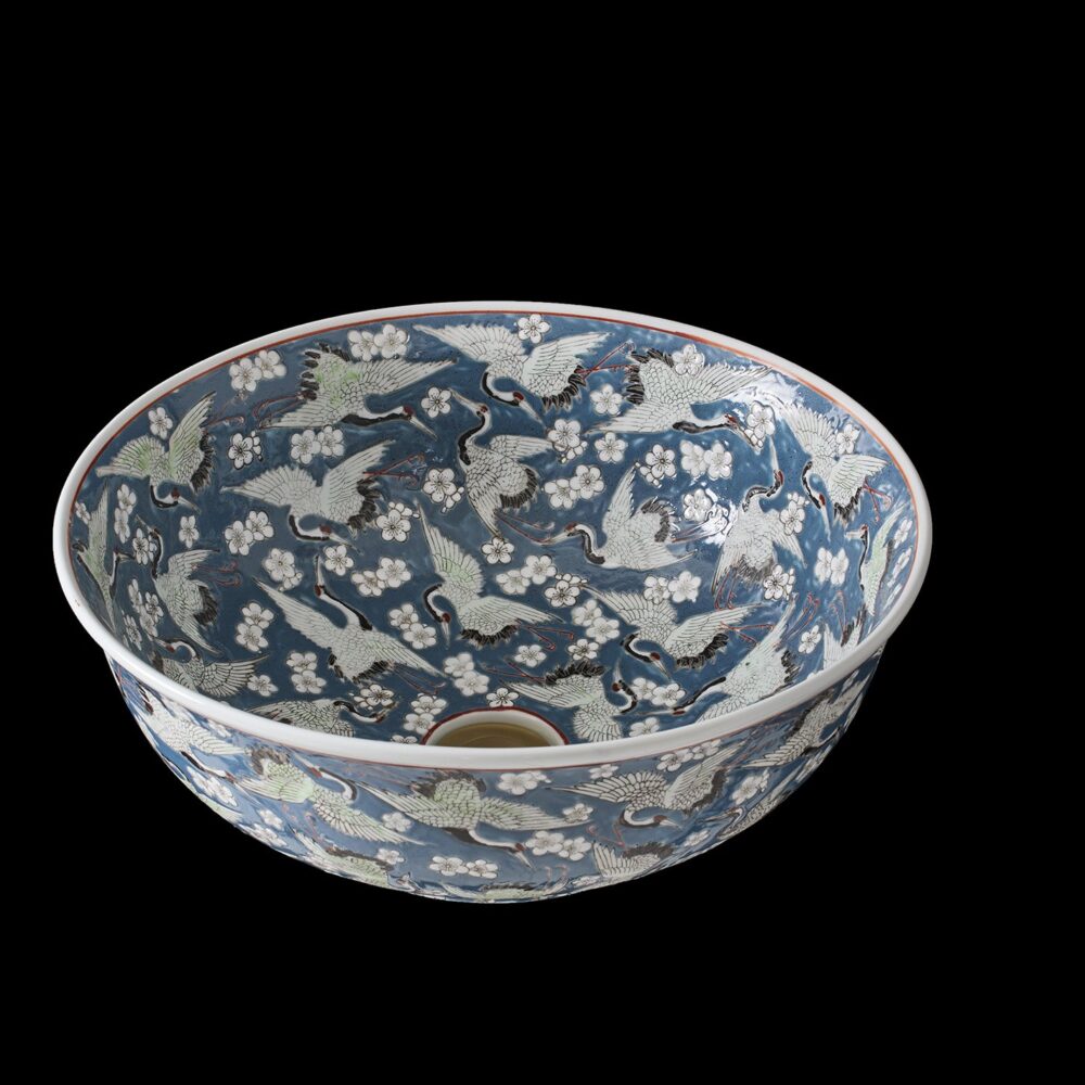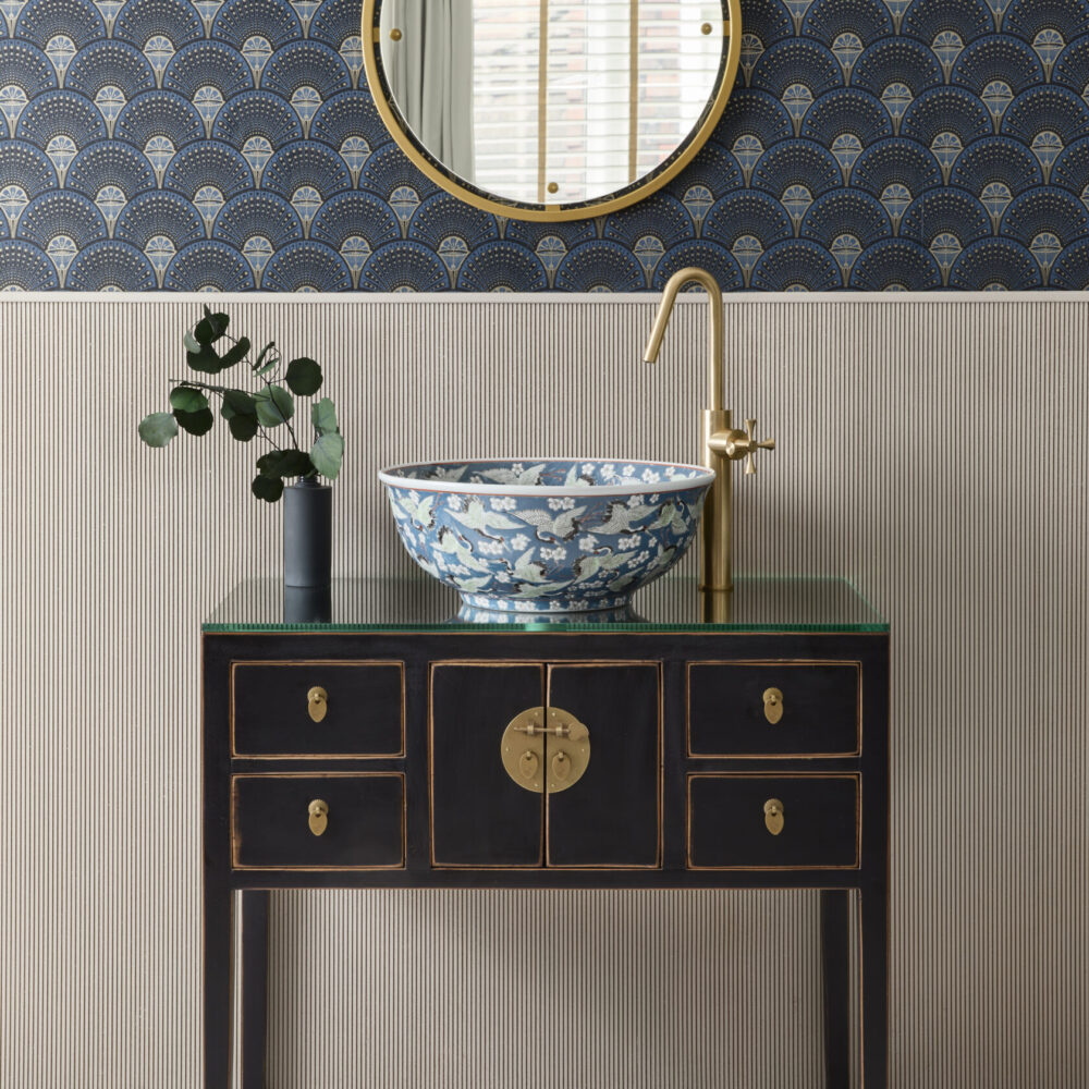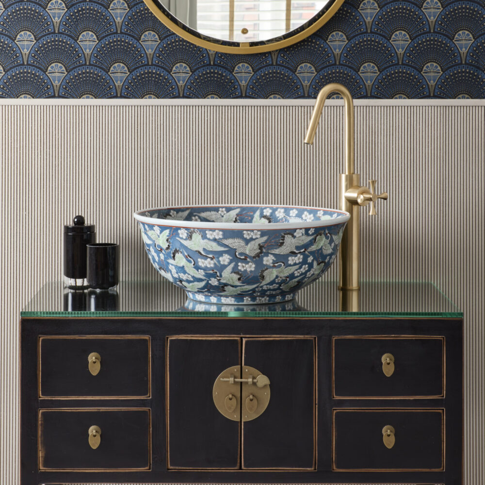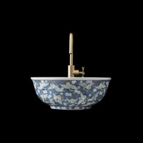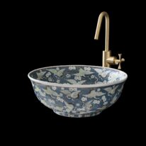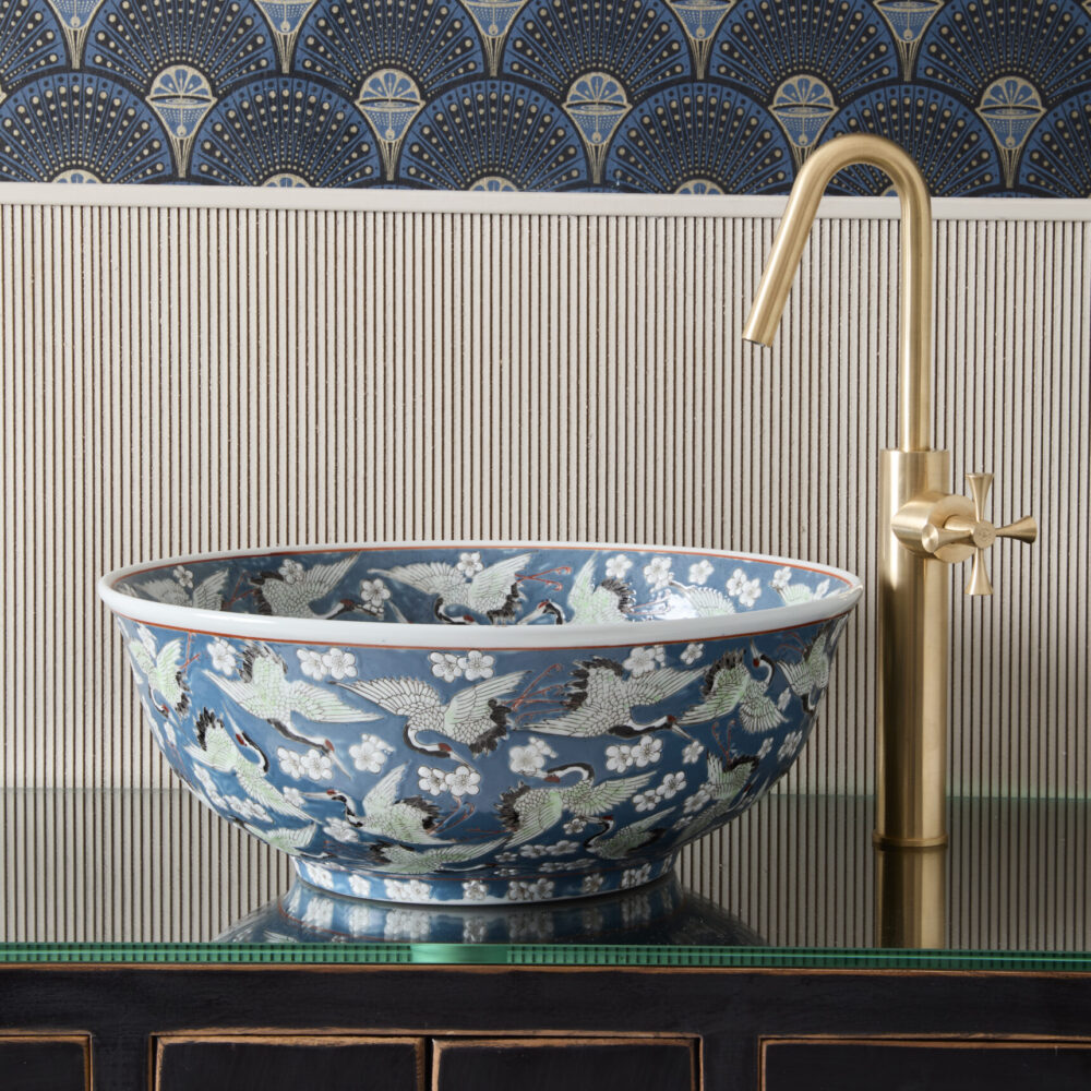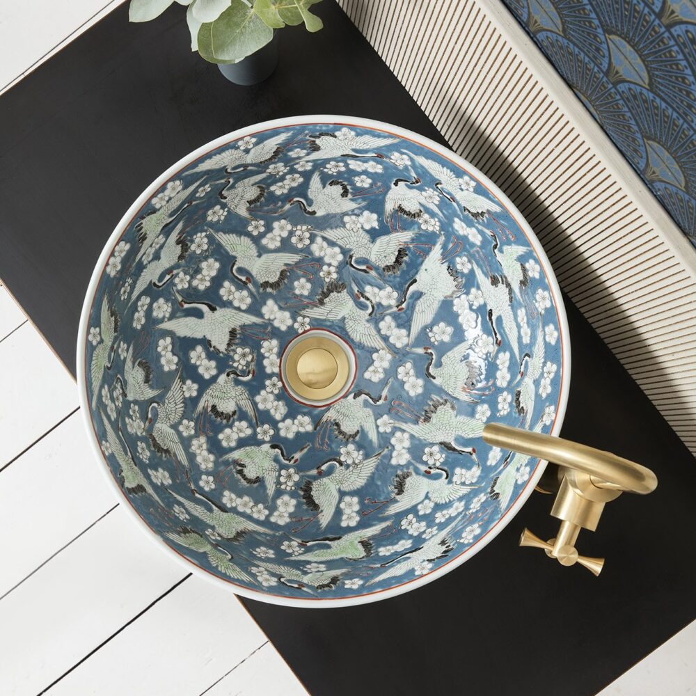 The Delphine countertop basin features graceful, gliding cranes, weaving in and out of a dotted trail of delicate white cherry blossoms. Very much in-line with the trend for flora and fauna, and featuring a beautiful woad blue backdrop with subtle burnt red accents, it makes for a charming addition to your bathroom or cloakroom.