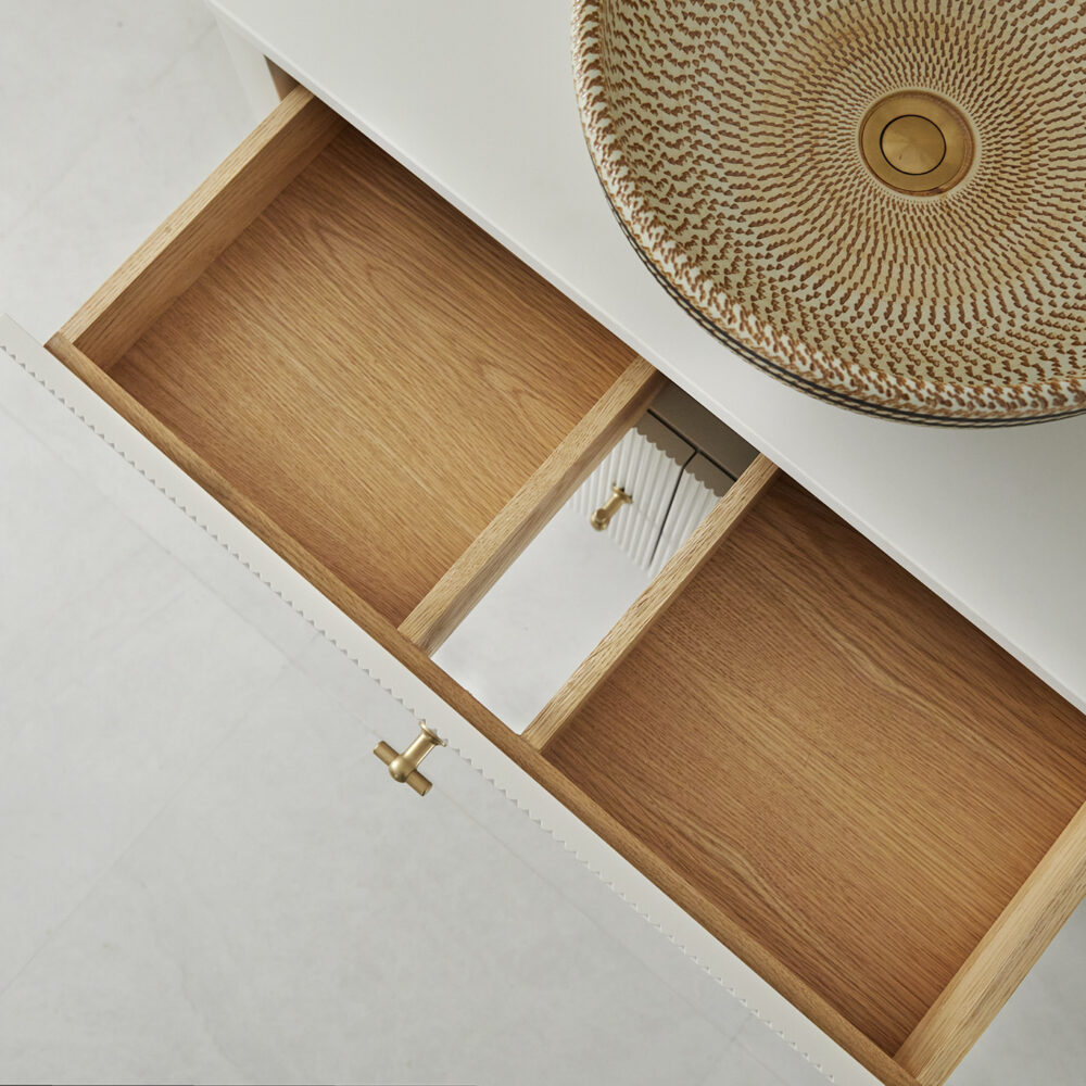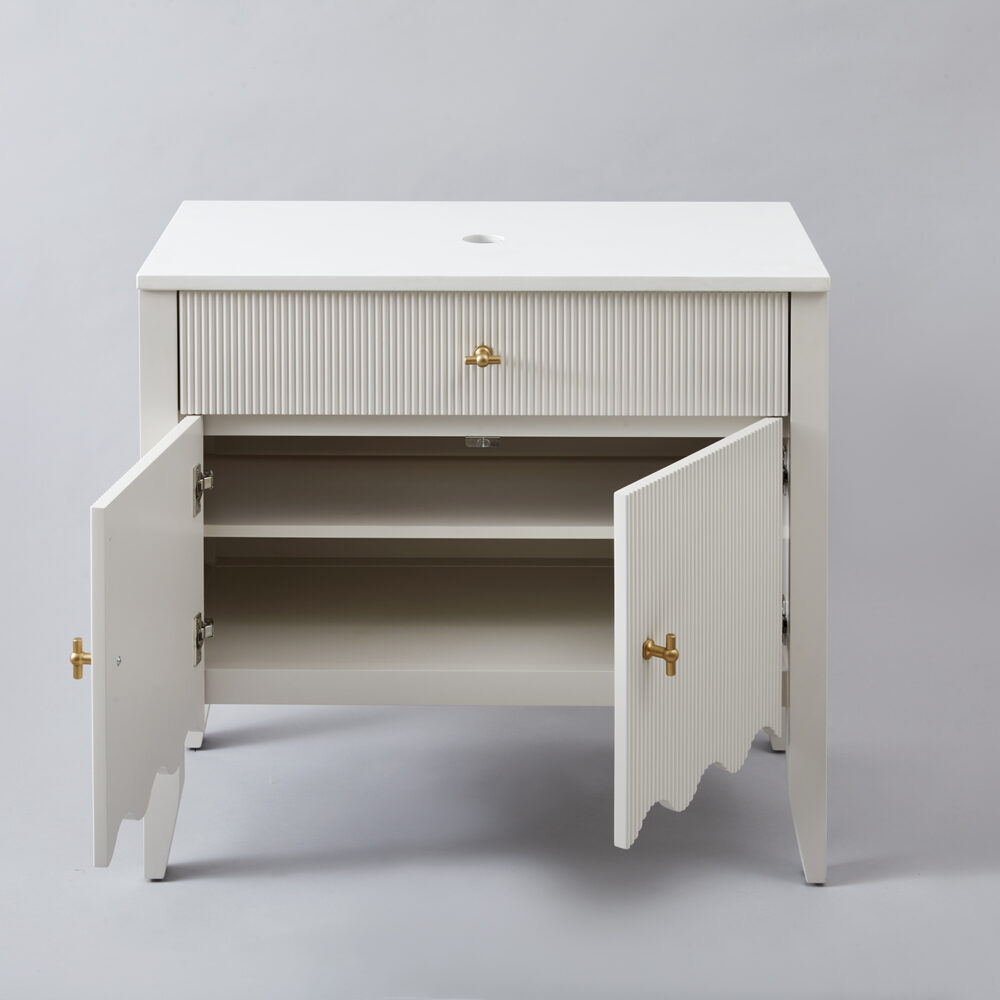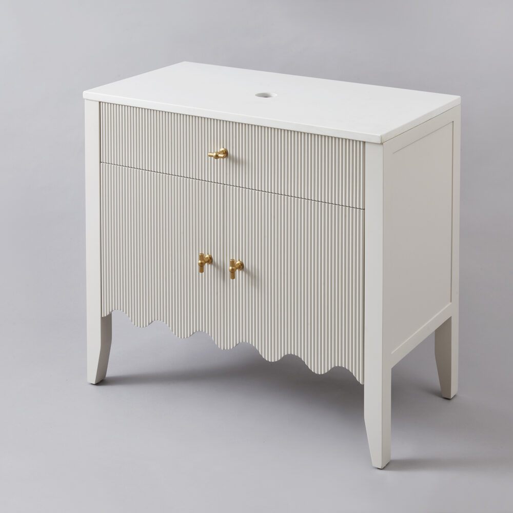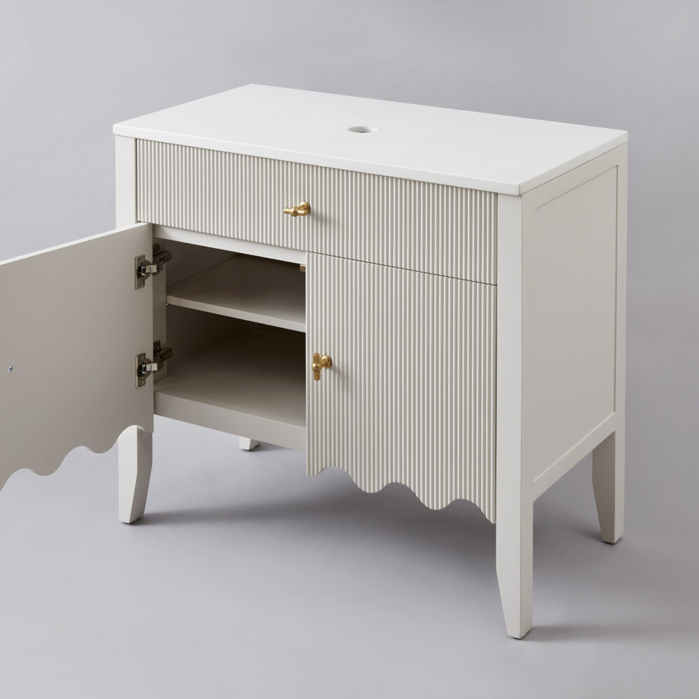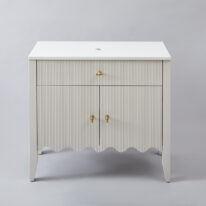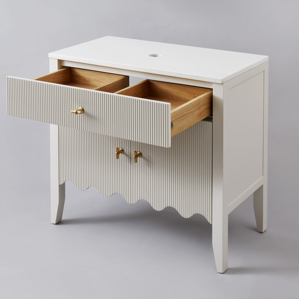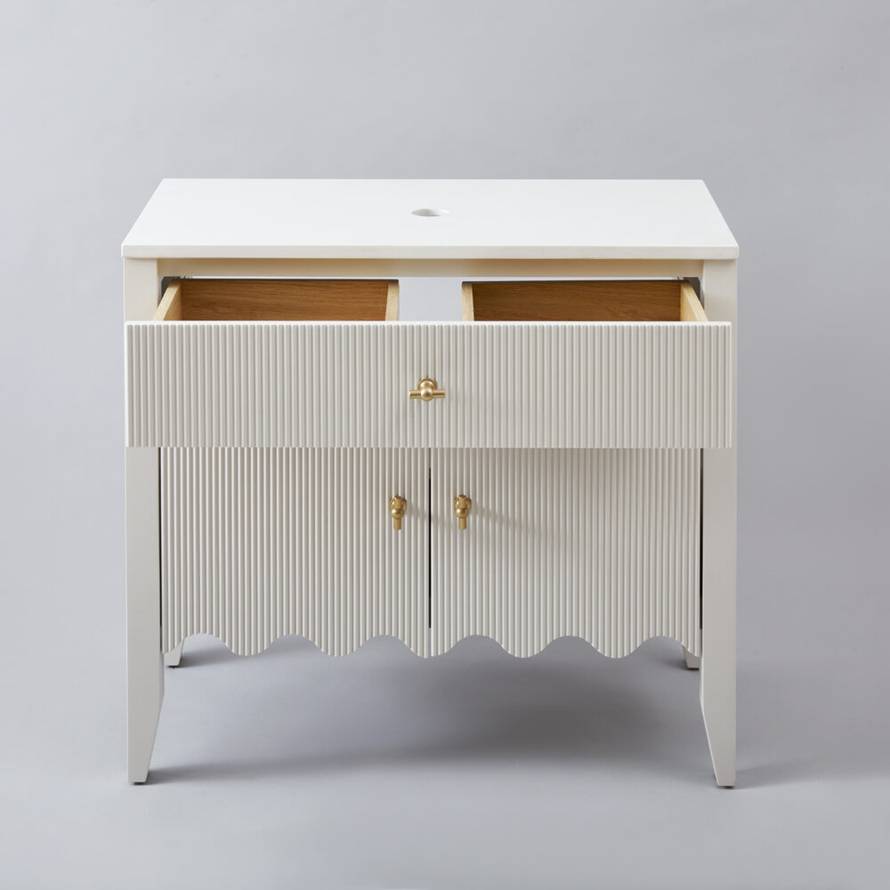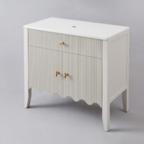 Skilfully combining elegance and playfulness, The Ellis bespoke vanity can be customised to perfectly suit any bathroom or cloakroom. Featuring a generous amount of storage, this sophisticated wooden vanity is elevated with decorative detailing; expertly crafted reeded panels and a distinctive scalloped edge. It is fitted with solid oak dovetailed drawers boxes, soft close door hinges & drawer runners and solid brass T-bar handles which make this vanity a pleasure to use.