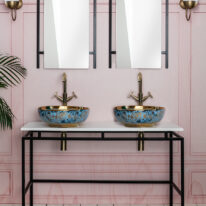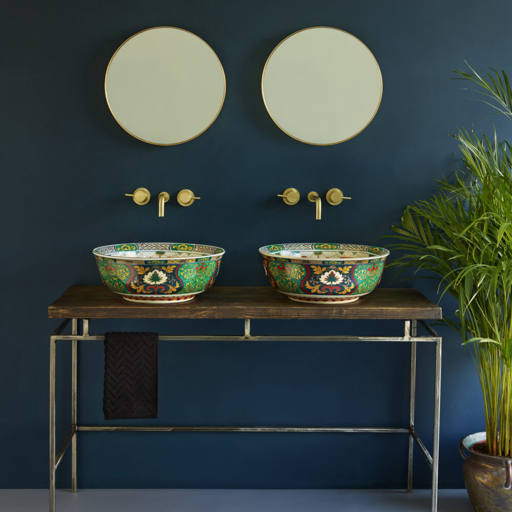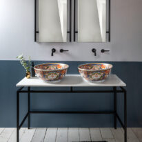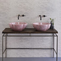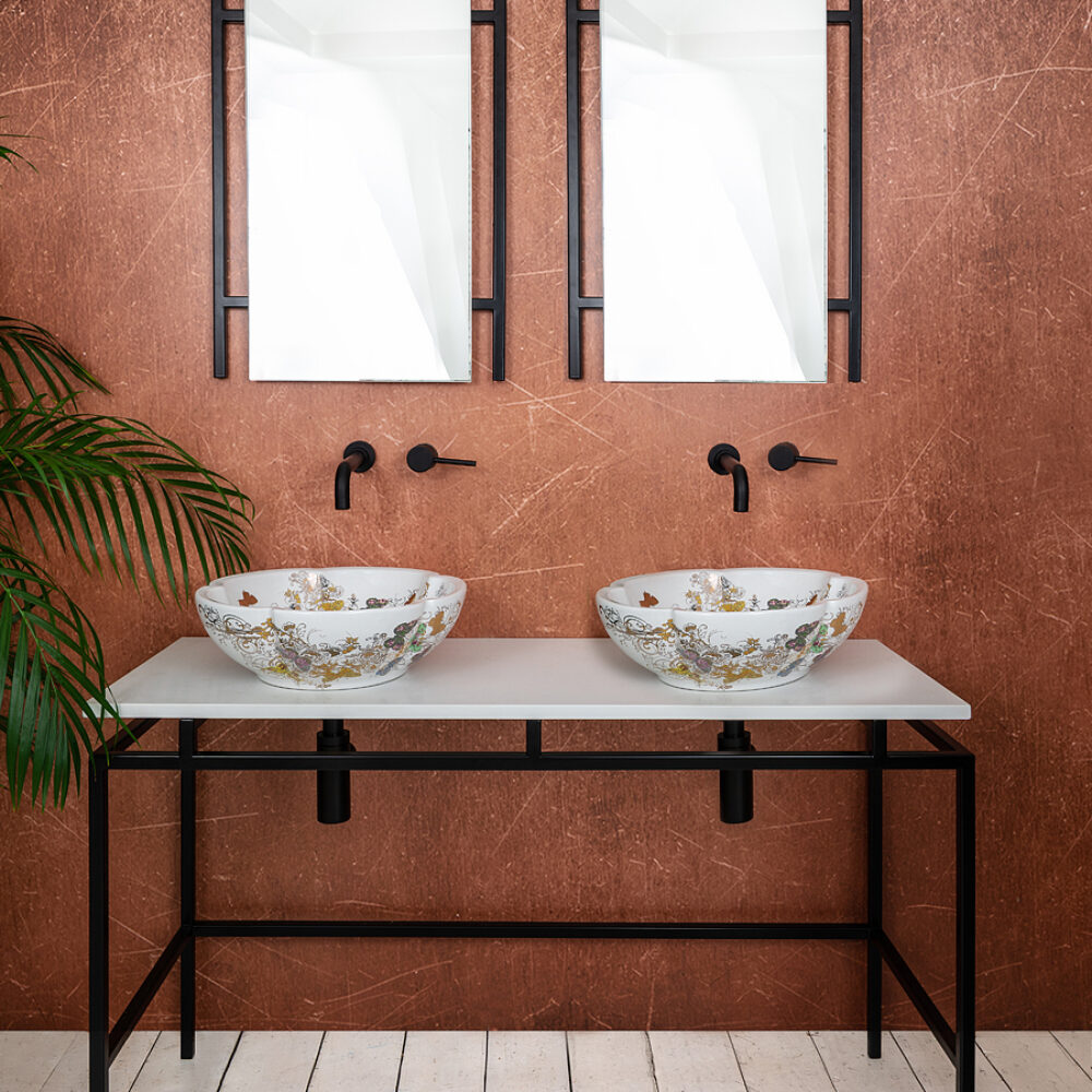 The perfect partner to any one of our hand-crafted porcelain basins, the Double Felix Vanity Unit brings a contemporary industrial feel to your bathroom. Handmade from durable steel and available in a range of finishes and matching surfaces which can be mixed and matched to create your desired bathroom aesthetic. Feature it as a decadent single vanity where there is a generous amount of space. Or style it as a ‘his’ and ‘hers’ vanity with two of our porcelain Basins.