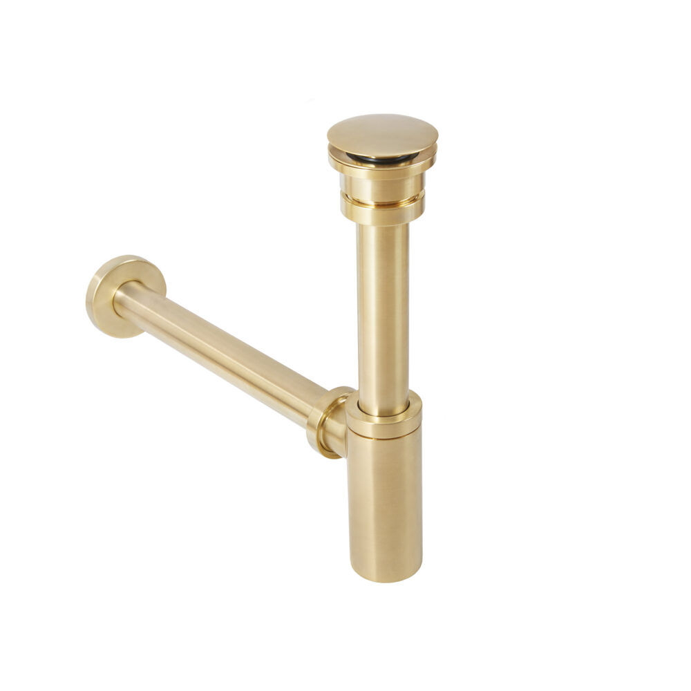With a wall pipe and round wall flange, this Jasper Waste & Bottle Trap comes in a Brushed Gold finish for a contemporary take on luxury. The matching unslotted click clack basin waste features a push button operation, designed for basins without an overflow.