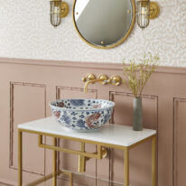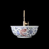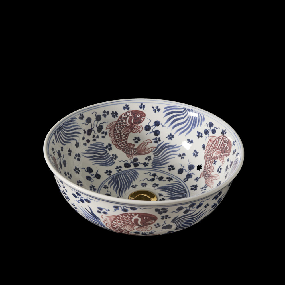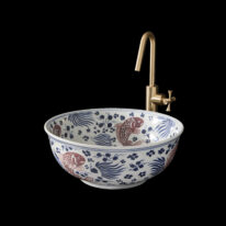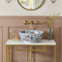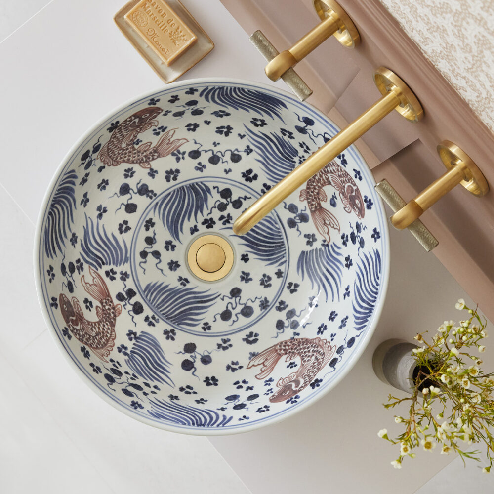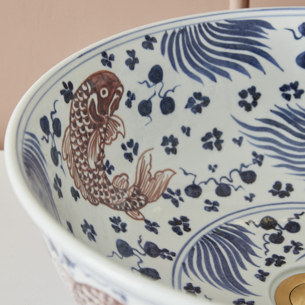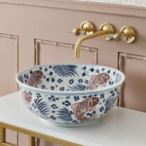 The Jemima countertop basin is an elegant yet exuberant design. A traditional blue and white colour scheme featuring hand-painted rose-pink Koi fish playfully circling around a whimsical pattern of reeds and sea flowers. The Koi fish symbolise strength and prosperity and are a nod to traditional Chinese porcelain design. Meticulously hand-painted and finished, every Jemima sink is unique and will make a charming addition to bathrooms and cloakrooms.