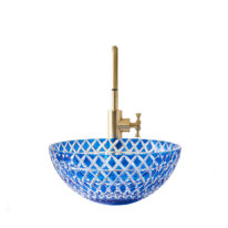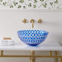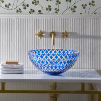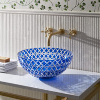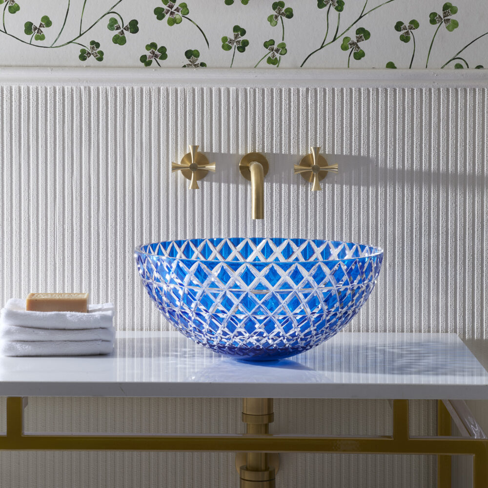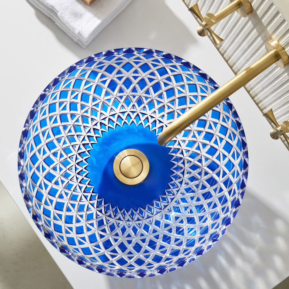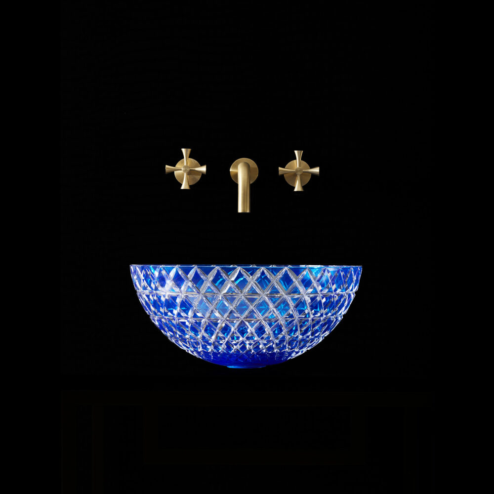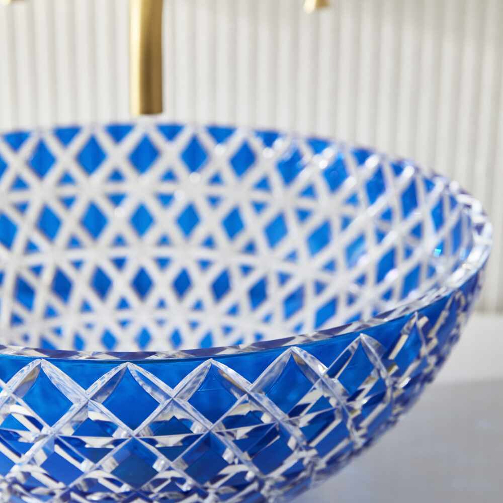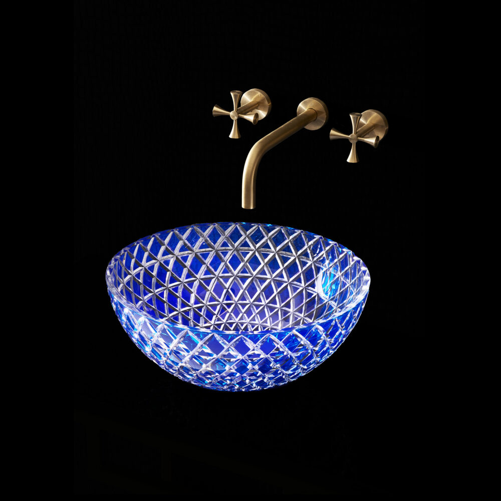 The Lucia – Blue countertop basin is skilfully hand-blown and cut by artisans using the finest Bohemian Crystal. It features a bright royal blue colour cut to clear which catches the light exquisitely. The interplay of refracting light, cut crystal and water casts beautiful shadows and creates a special glow. Balancing artistry with enduring craftsmanship the Lucia basin celebrates beauty and creativity. Bohemian crystal is one of Europe’s most luxurious, durable and unique materials, having risen in prominence and fame during the Renaissance period and has graced some of the finest palaces to jewellery collections in the world.