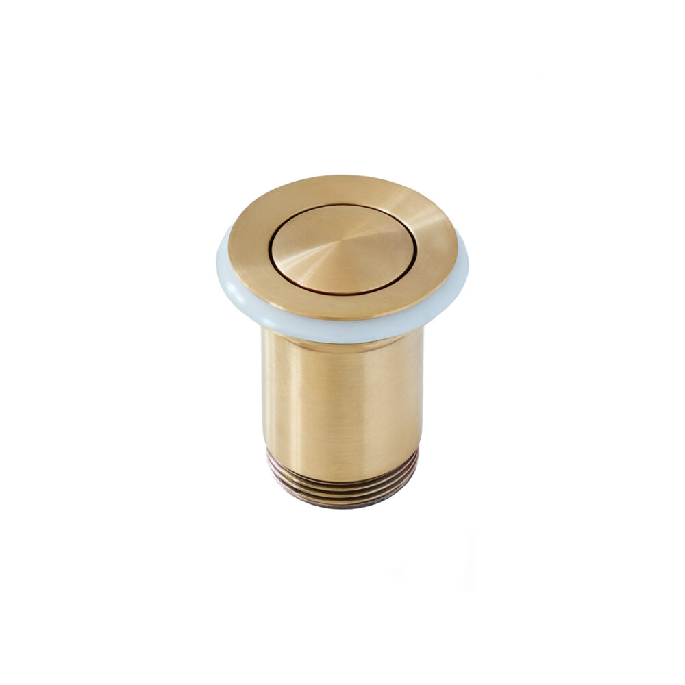 The stylish Reuben unslotted click clack basin waste in brushed brass, features a push button operation, designed for basins without an overflow. A lacquered brass finish allows for easy maintenance.