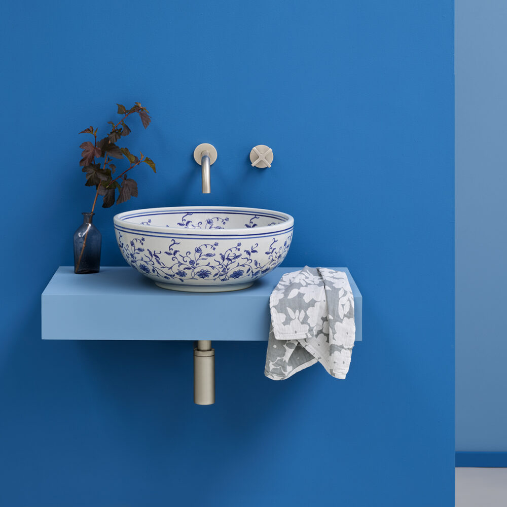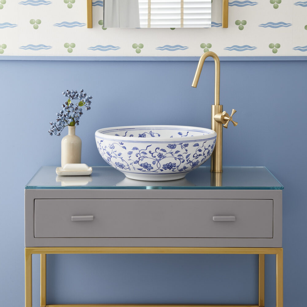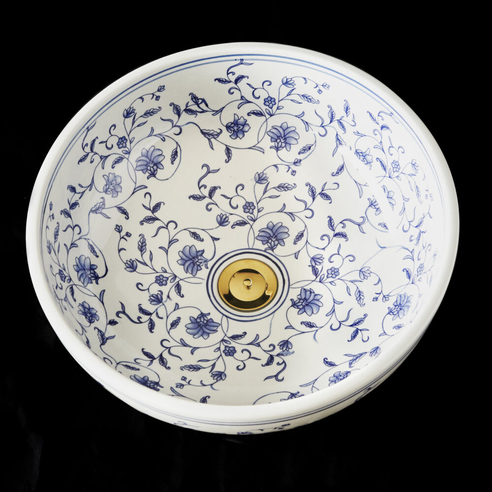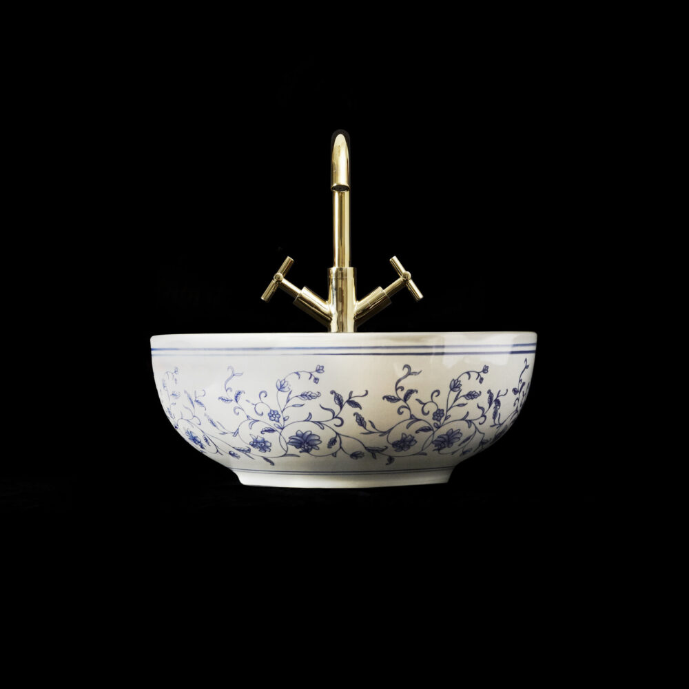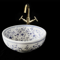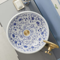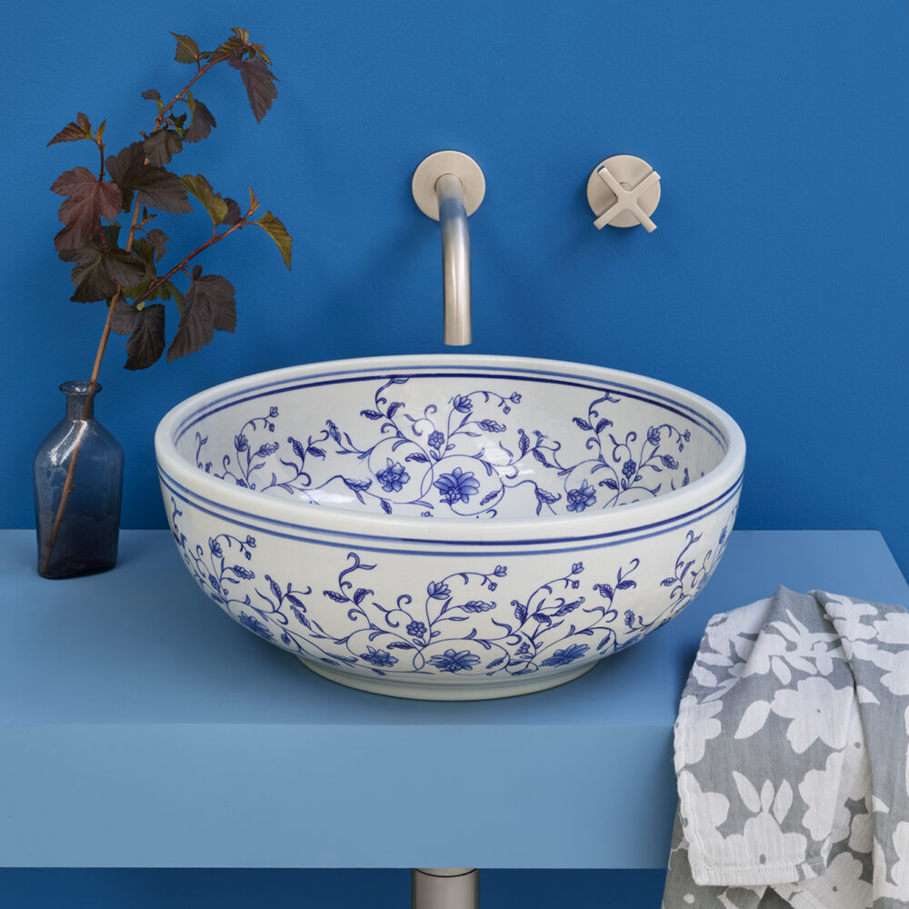 Simple, elegant and carrying hints of antique style, the Rosaline countertop basin comes with a delicate blue and white floral chinoiserie pattern, both inside and outside, with a double line border around the edge. Blue and white ceramics gained popularity in the 14th century – and continue to have a lasting appeal for bathrooms around the world.