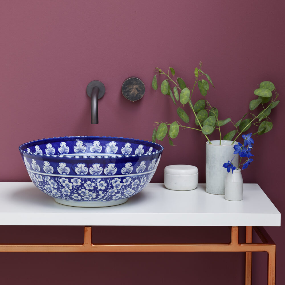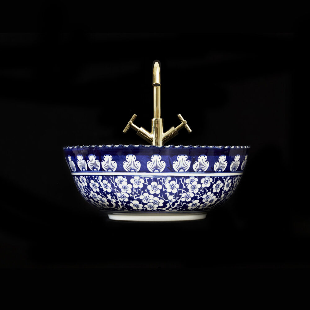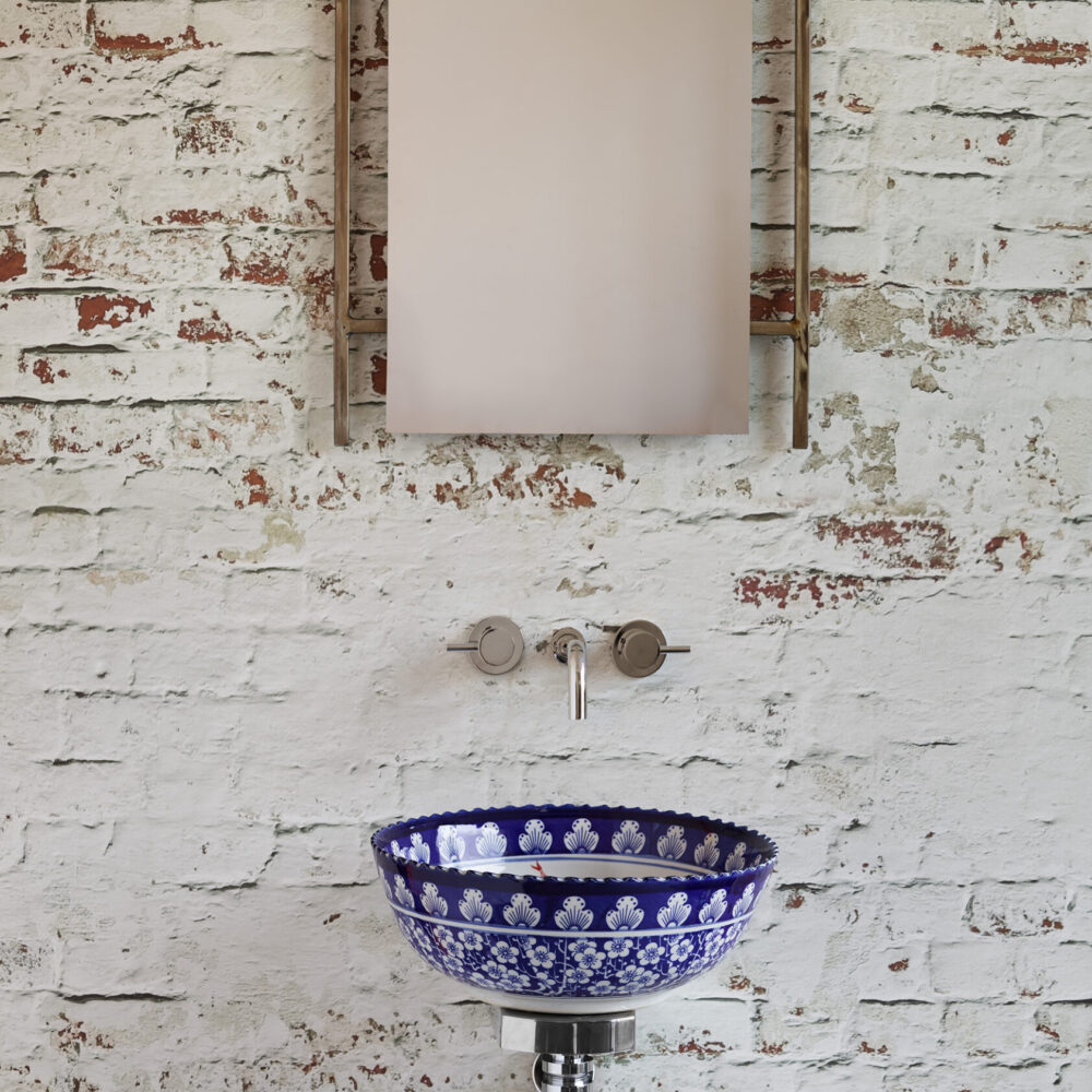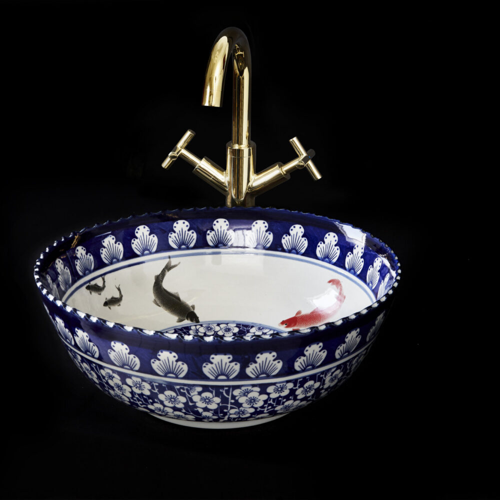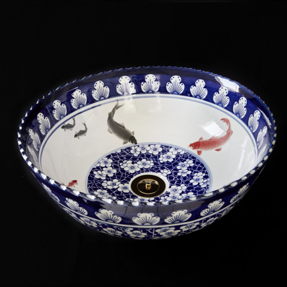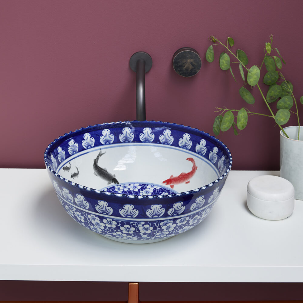 A twist on our ever-desirable Lorelei basin, this scalloped design adds an intricate detail that sets off the classic blue and white pattern that was inspired by traditional Oriental porcelain. Inside, the fish and lotus blossom motifs signify wealth and abundance, adding a touch of good fortune to your bathroom space. The Scalloped Lorelei is also available without the fish detail.