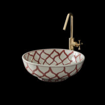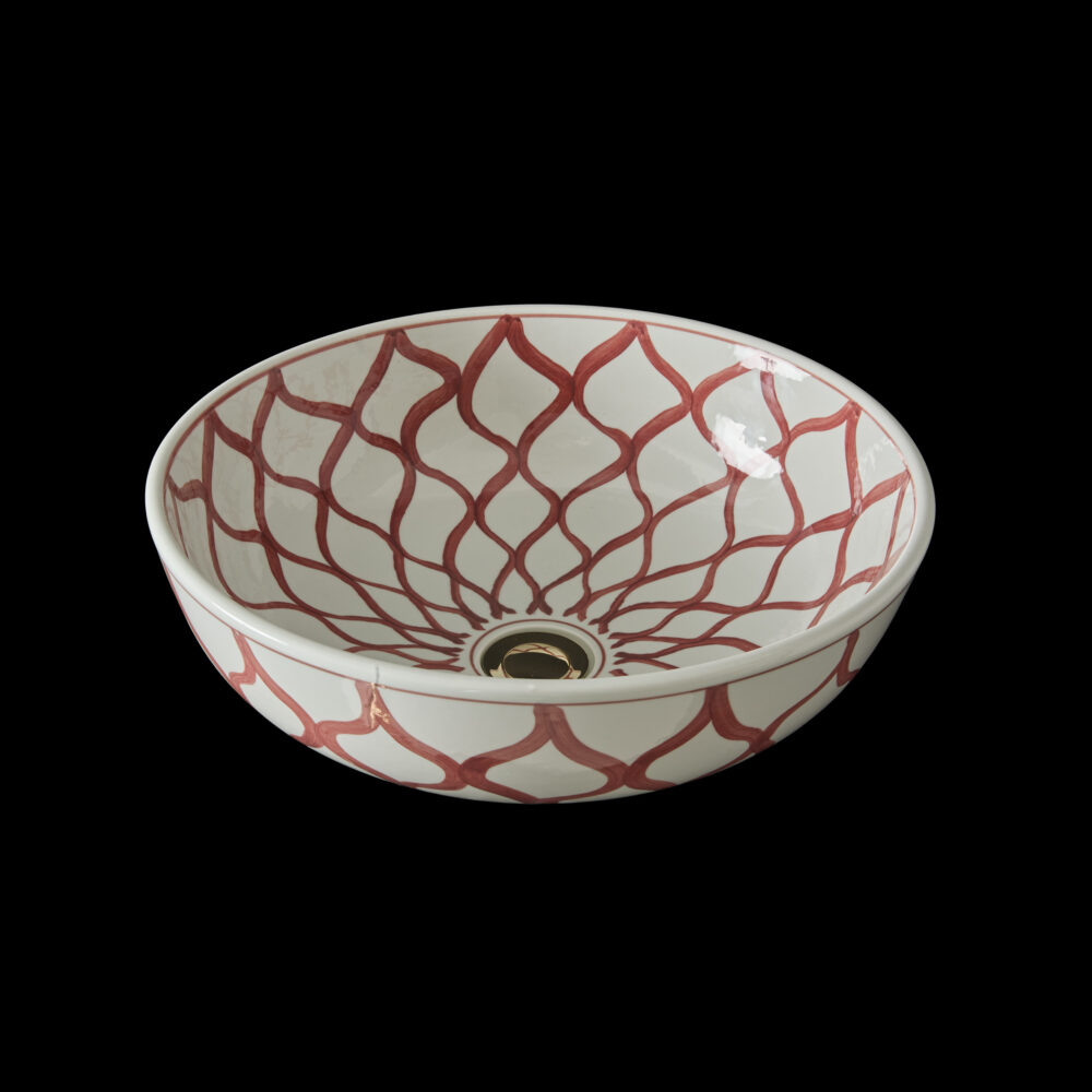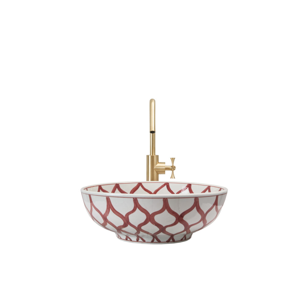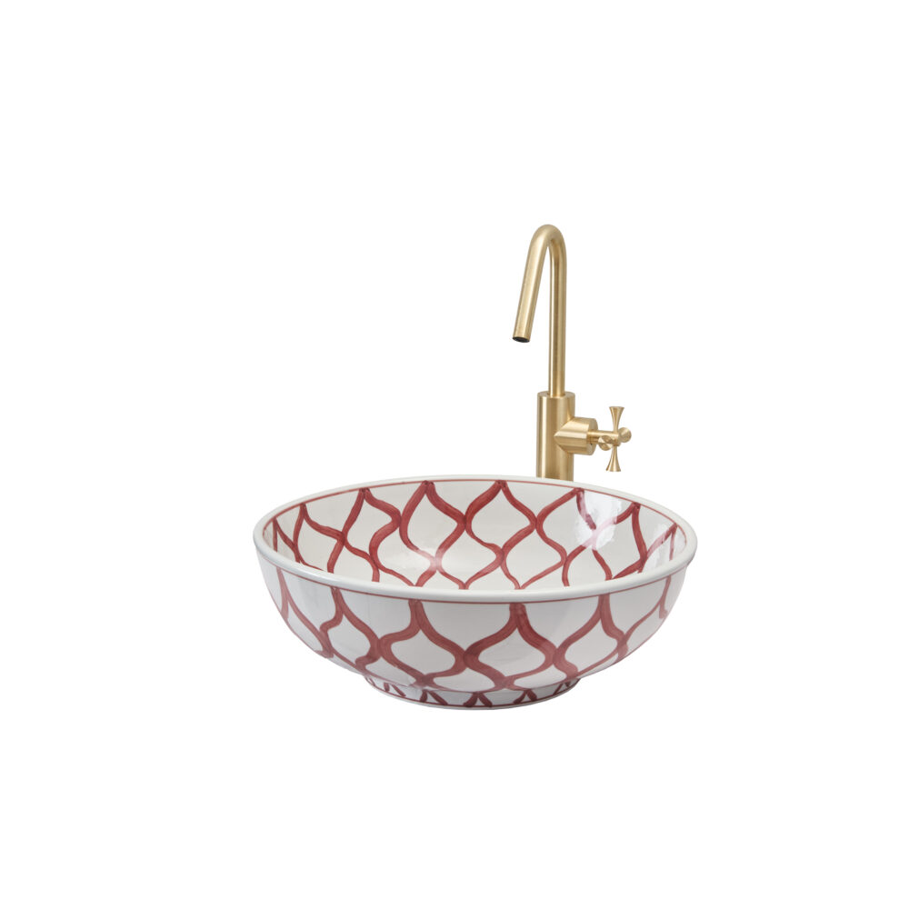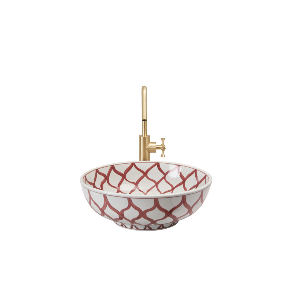 The Sienna countertop basin is a modern interpretation of classic geometric design. Drawing inspiration from the intricate decorative motifs of Morocco, its patterns are paired back and reimagined for a contemporary twist, making it perfect for both bold and understated interiors. Soft, flowing curves give the sink an elegant feel, and the striking hand-painted terracotta lines add warmth and character. Crafted from the finest porcelain, the Sienna offers exceptional durability and beauty, making it a standout feature in any bathroom or cloakroom.