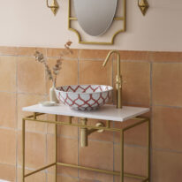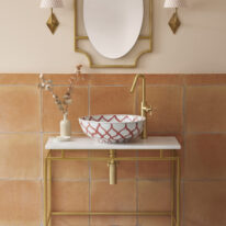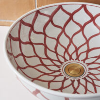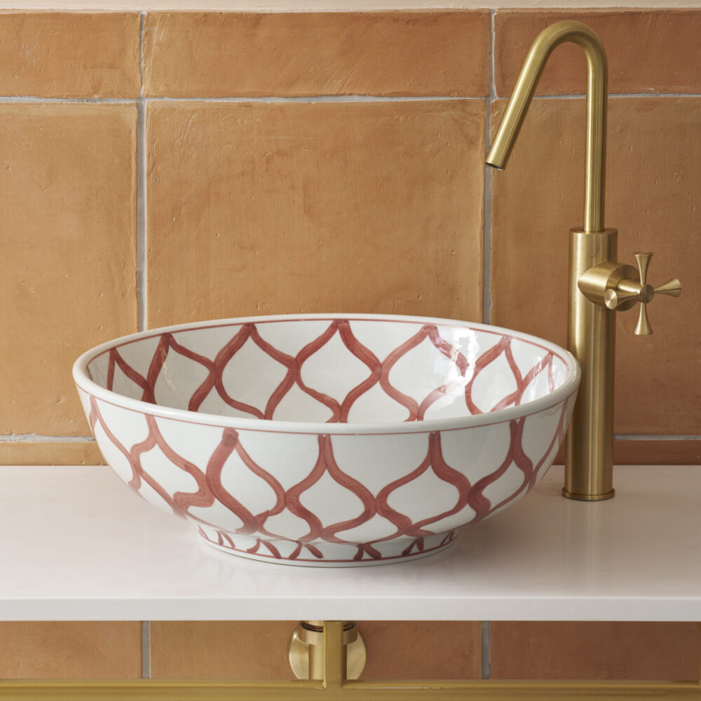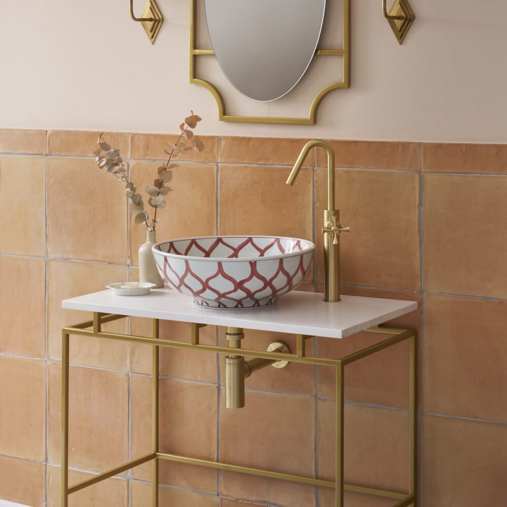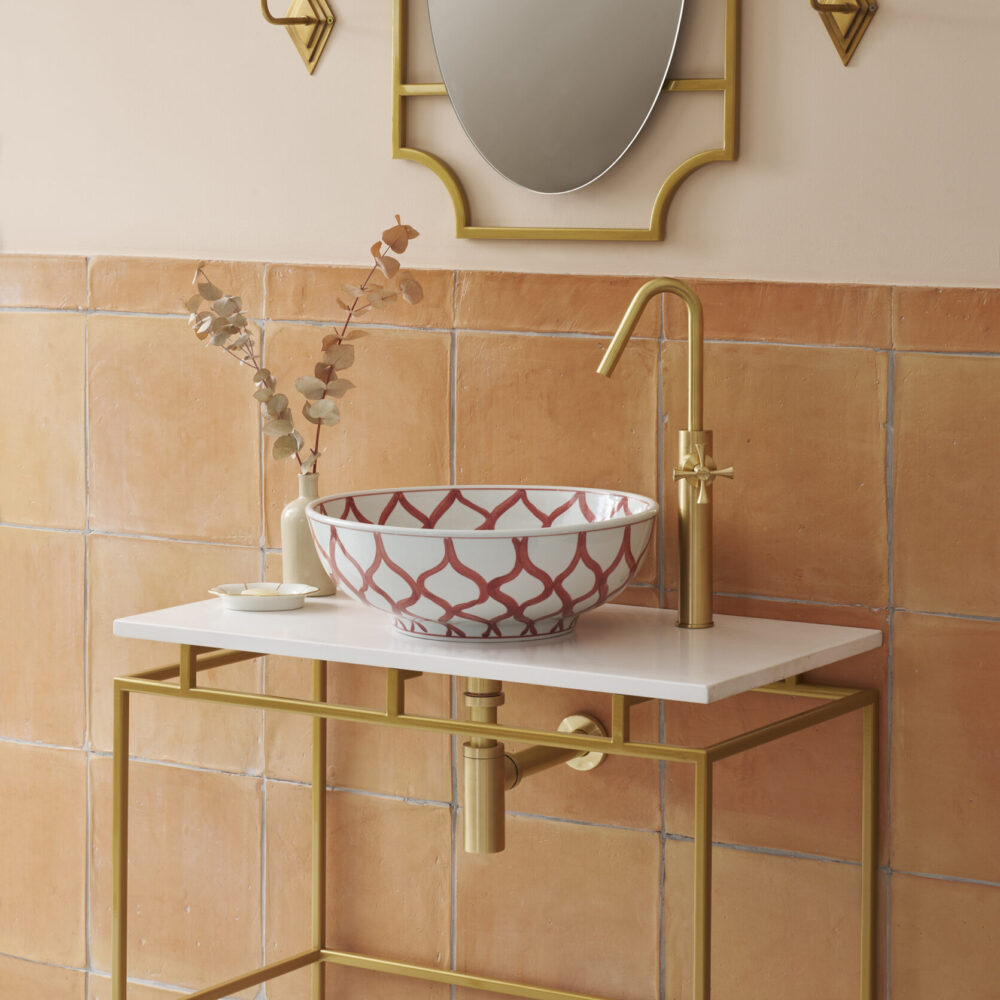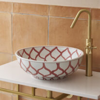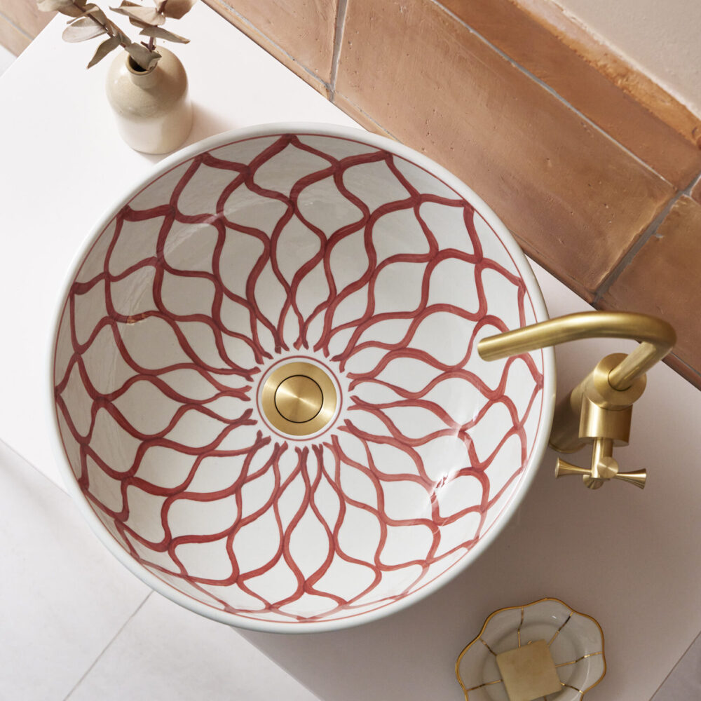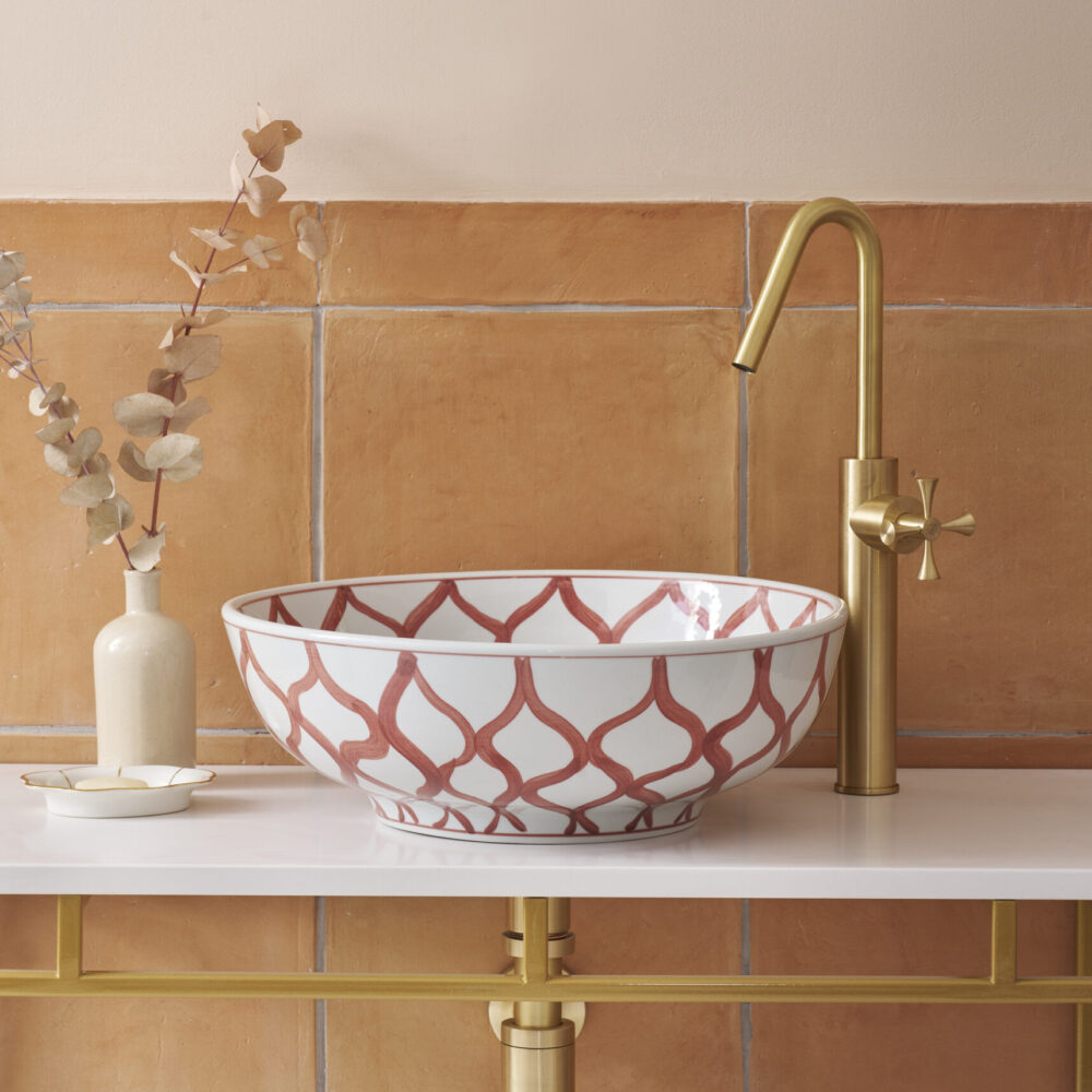 The Sienna countertop basin is inspired by classic geometric design, reimagined with a modern, hand-painted finish. Drawing influence from the decorative motifs of Morocco, its patterns are pared back and reinterpreted for a contemporary twist, making it perfect for both bold and understated interiors. Soft, flowing curves give the sink an elegant feel, while striking hand-painted terracotta lines add warmth and character. Crafted from the finest porcelain, the Sienna offers exceptional durability and beauty, making it a standout feature in any bathroom or cloakroom.