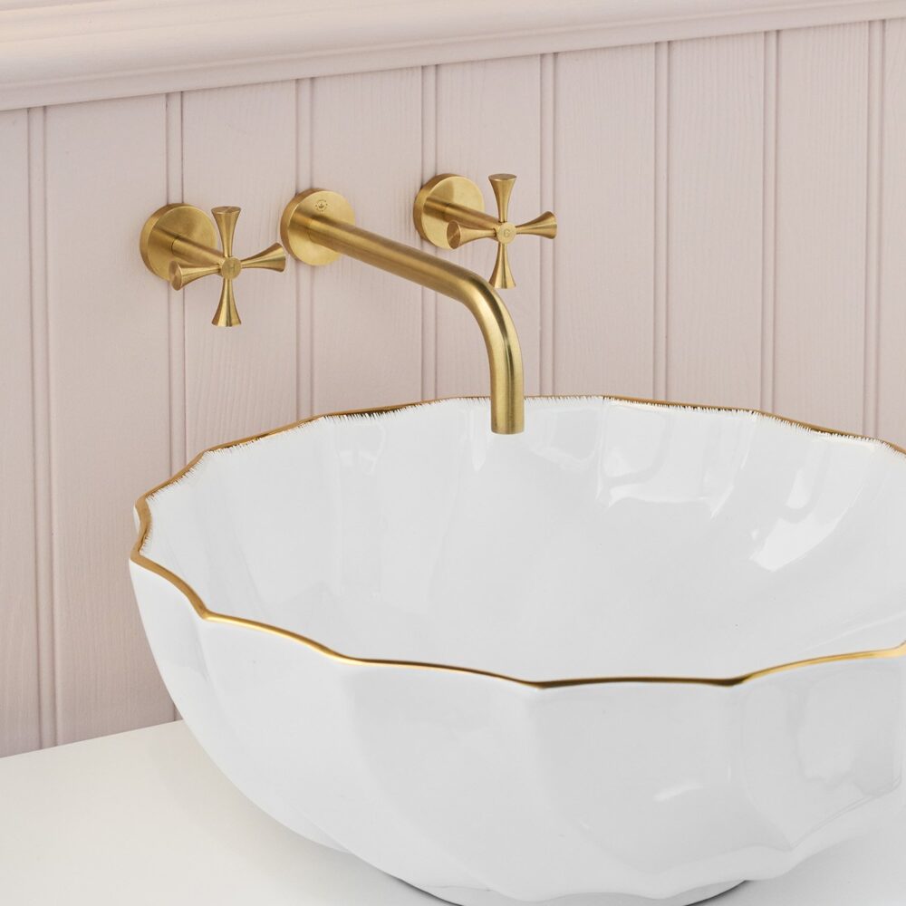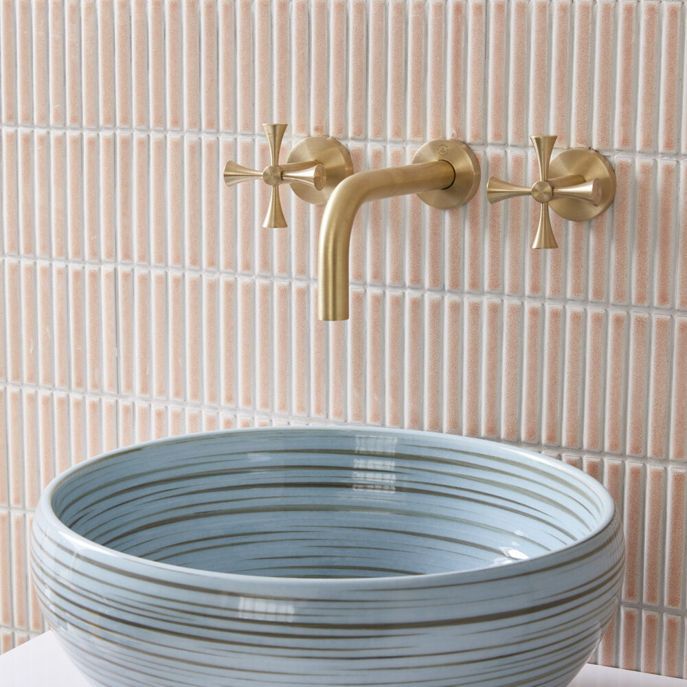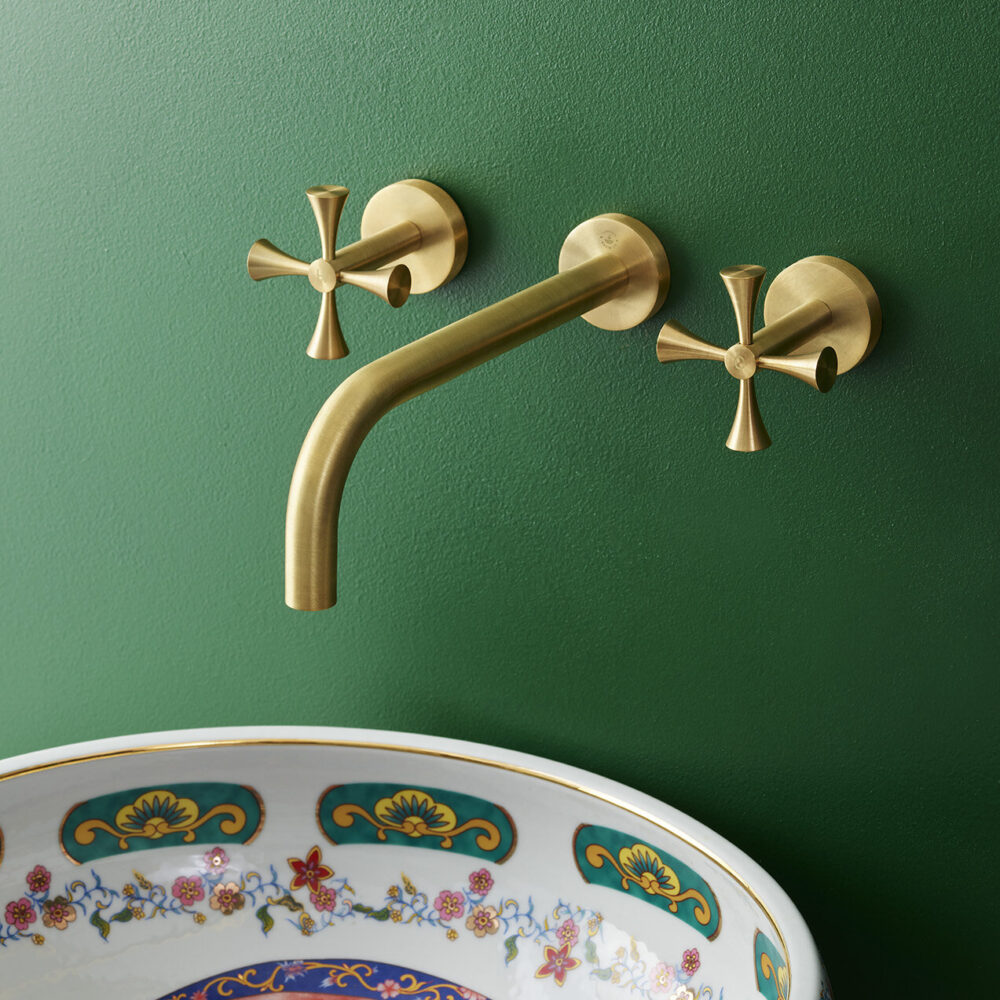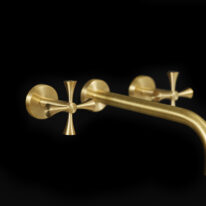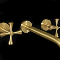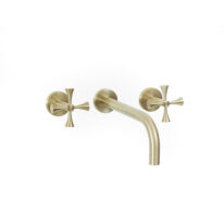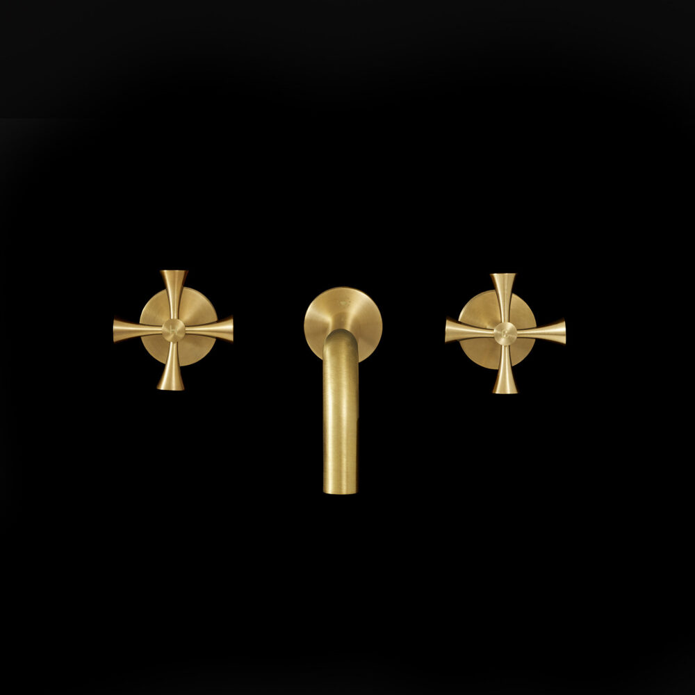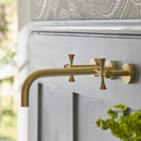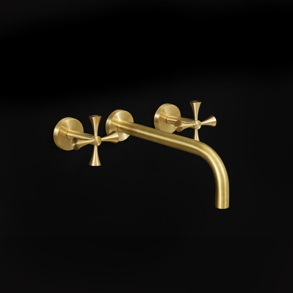 Handmade from solid brass, the Theo Tap in Brushed Brass is a contemporary three -hole wall-mounted tap characterised by a stylish curved spout and unique cross head mixers. Strong yet refined, its carefully balanced proportions bring a sophisticated edge to bathroom interiors.The innovative unlacquered finish ages naturally to a beautiful patina over time or it can be polished to maintain its original finish.