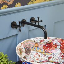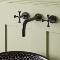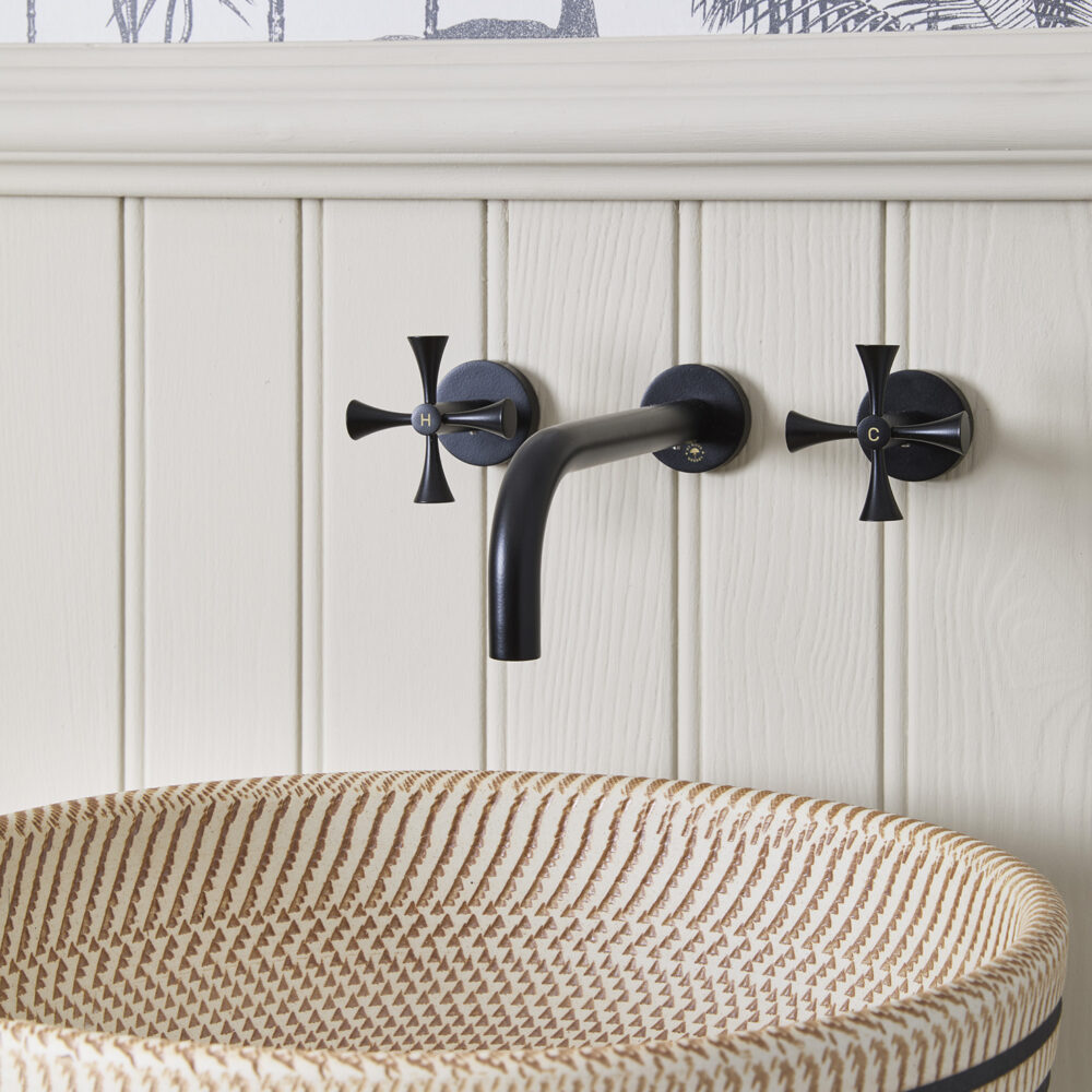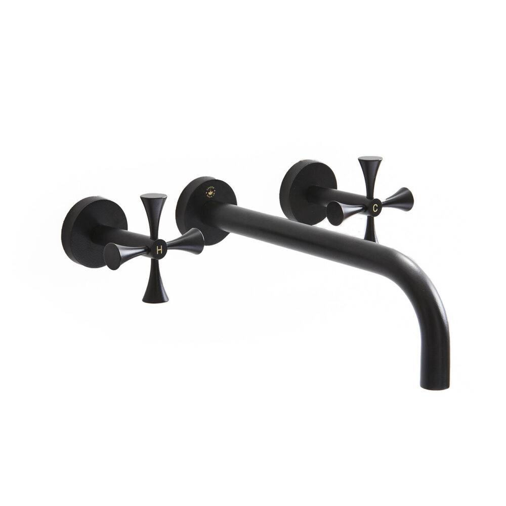 Handmade from solid brass and characterised by a stylishly curved spout and unique cross head mixers, the Theo Tap in Matt Black is a contemporary three -hole wall-mounted tap. Strong yet refined, its carefully balanced proportions bring a sophisticated edge to bathroom interiors.