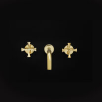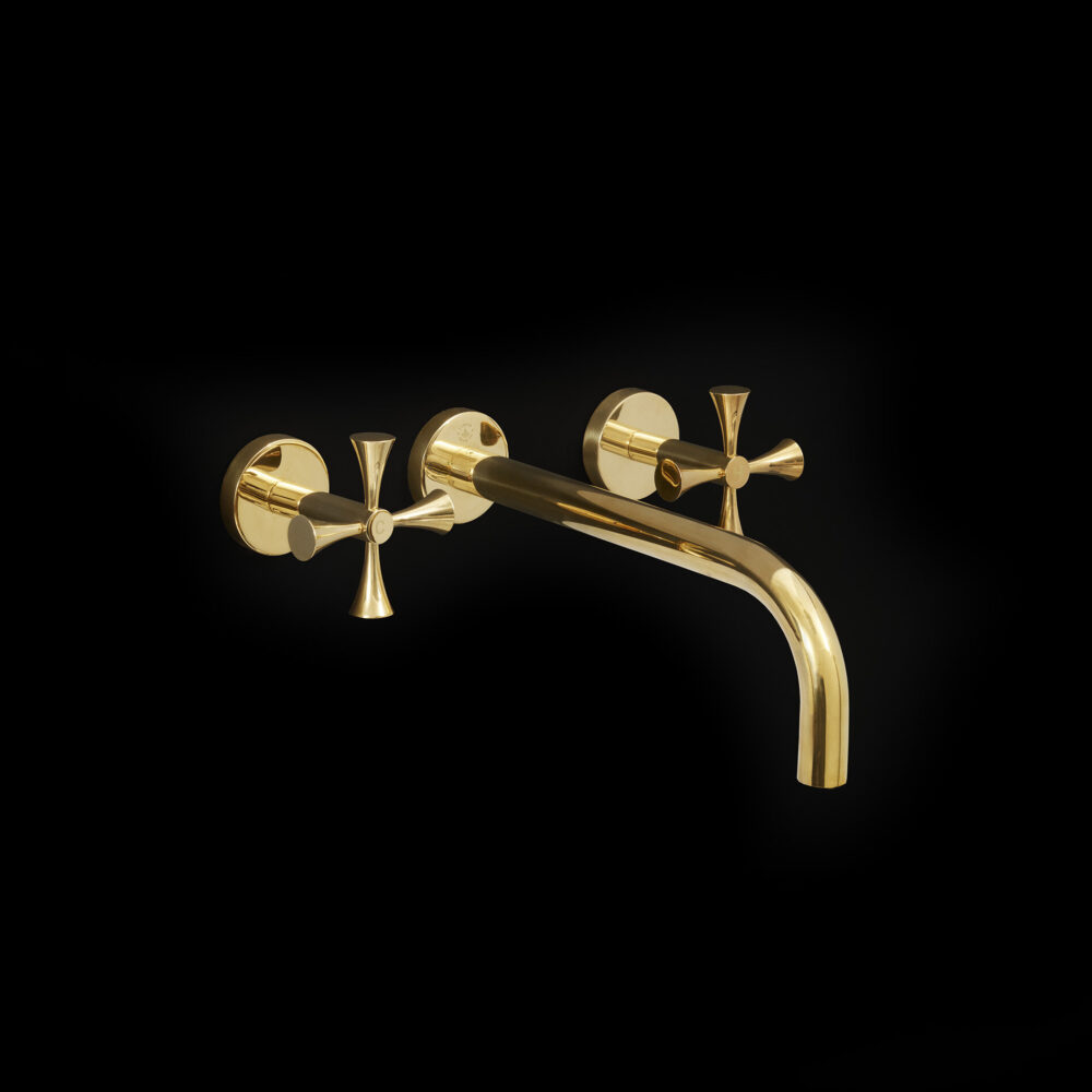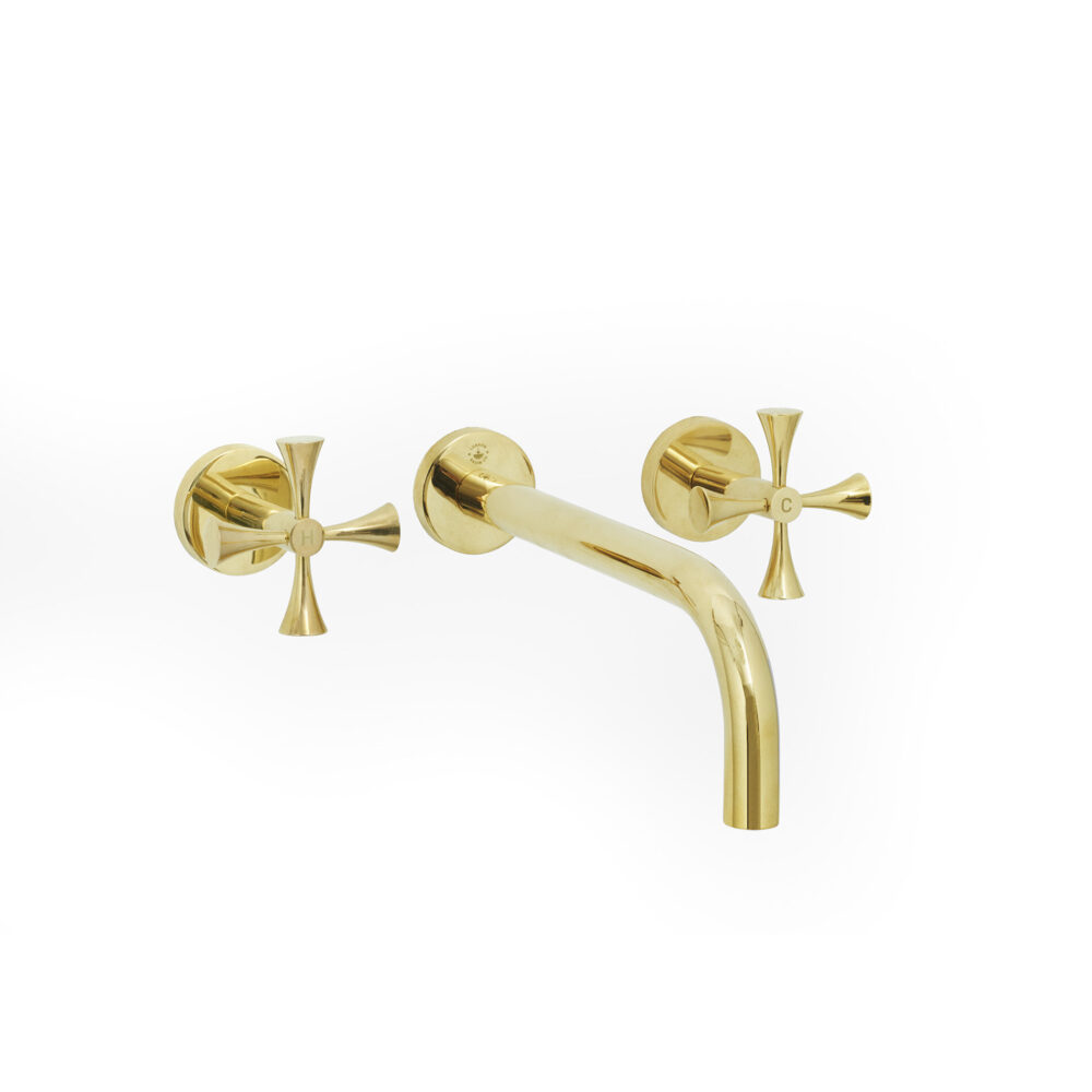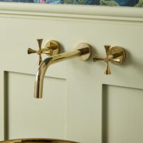 The Theo Tap in Polished Brass is a contemporary three-hole wall-mounted tap characterised by a stylish curved spout and unique cross head mixers. Strong yet refined, its carefully balanced proportions bring a sophisticated edge to bathroom interiors, while the unlacquered finish ages naturally to a beautiful patina over time or it can be polished to maintain its original finish.