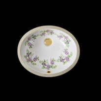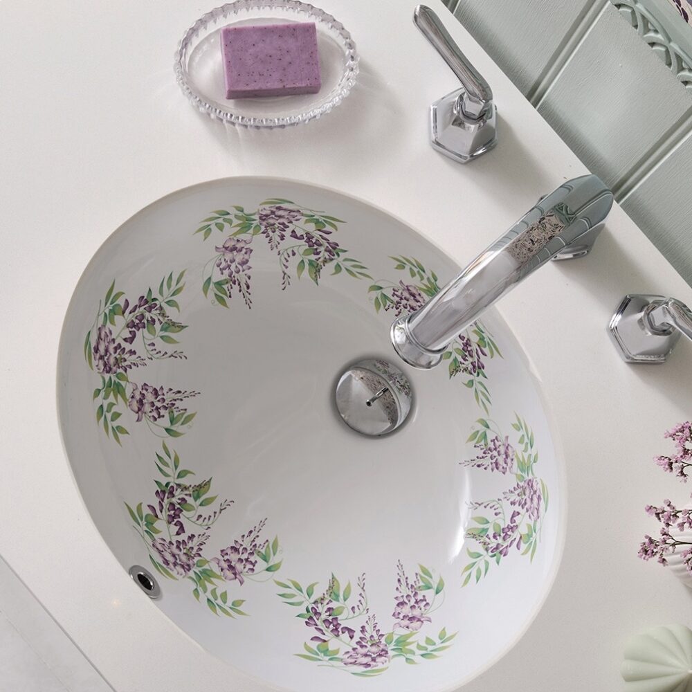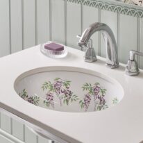 Contact usThe Wisteria undermount basin showcases a captivating design of lilac wisteria in full bloom, gracefully intertwined with delicate green vine leaves.
