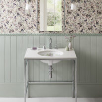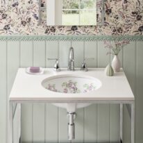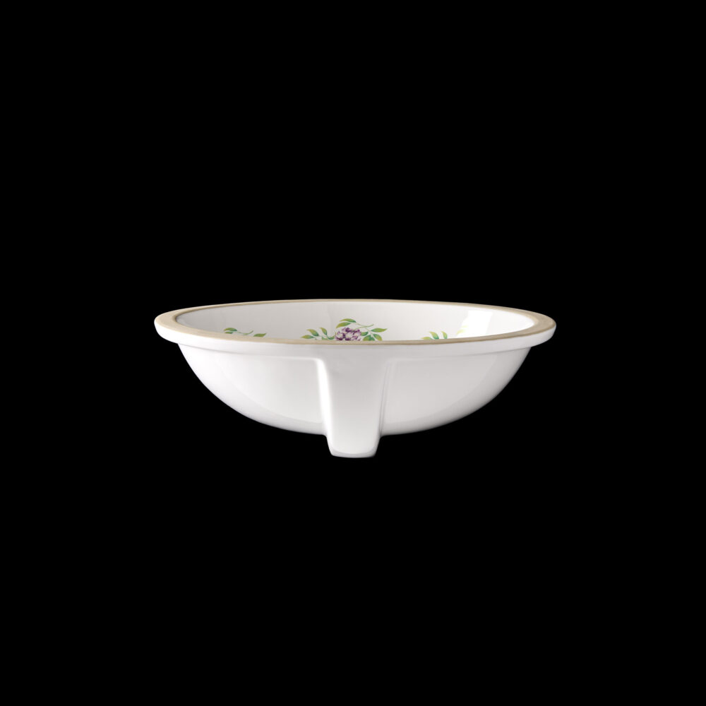 The Wisteria undermount basin showcases a captivating design of lilac wisteria in full bloom, gracefully intertwined with delicate green leaves. A modern take on a traditional Victorian design that celebrates the beauty of nature. The intricate pattern perfectly complements the glossy white porcelain backdrop and is sure to make a statement is any bathroom or cloakroom. The basin’s exterior is also glazed to widen design options, so it can be used either as an undermount basin fully exposed to show off its full beauty. Each basin is crafted by hand; making each piece unique.